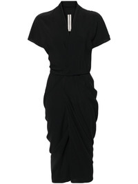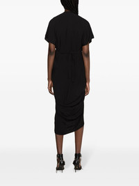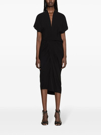 V-neck wrap midi dress Highlights - Black - Wrap design - V-neck - Short sleeves - Raw-cut edge - Tie-fastening straps - Straight hem - Unlined - Mid-length Made in Italy Composition FSC Viscose 84%, FSC Acetate 16% SIZE & FIT Model measurements Height 5 ft 11 in(1.8 m) Bust/Chest 34.25 in(87 cm) Hips 35.82 in(91 cm) Waist 24.8 in(63 cm) Measurement LENGTH 55.9 in(142 cm) FittingInformation Designed for a wraparound style that can be adjusted to your preference Made from a midweight non-stretch fabric, this piece offers minimal elasticity when worn This piece fits true to size – take your usual size Washing instructions Dry Clean Only