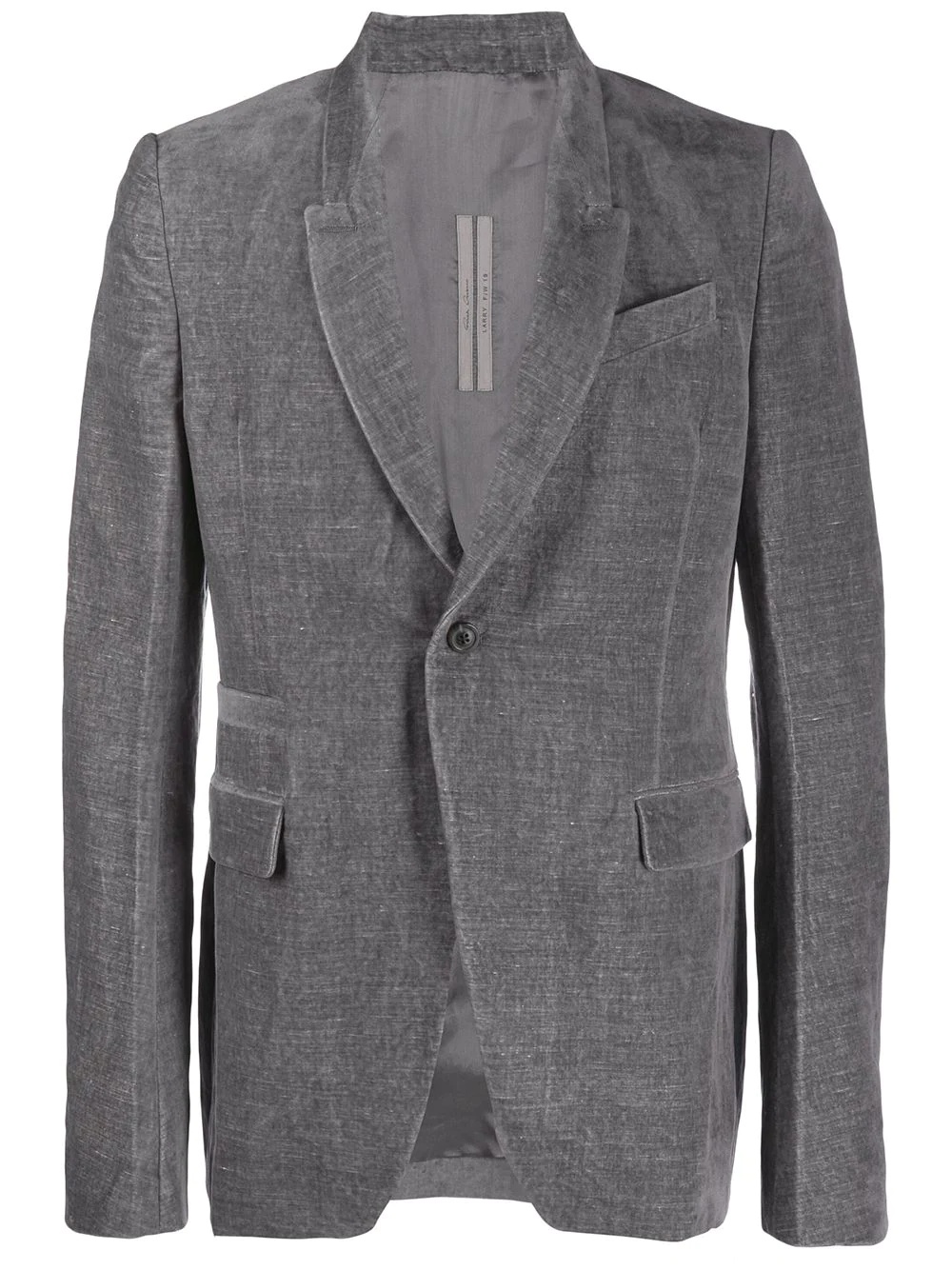 velvet blazer Rick Owens is renowned for his avant-garde aesthetic that pushes the boundaries of traditional shapes. This grey cotton blend velvet blazer from Rick Owens features a shawl lapel, a concealed front pocket, a button fastening, long sleeves and two front pockets. Made in Italy Composition Outer: Cotton 60%, Linen/Flax 40% Lining: Cotton 100%, Viscose 53%, Cupro 47% SIZE & FIT Model measurements Height 6 ft 2 in(1.87 m) Bust/Chest 37.79 in(96 cm) Hips 37.79 in(96 cm) Waist 30.31 in(77 cm) FittingInformation This piece fits true to size. We recommend you get your regular size Cut for a slim fit Made with a mid-weight fabric Washing instructions Hand Wash
