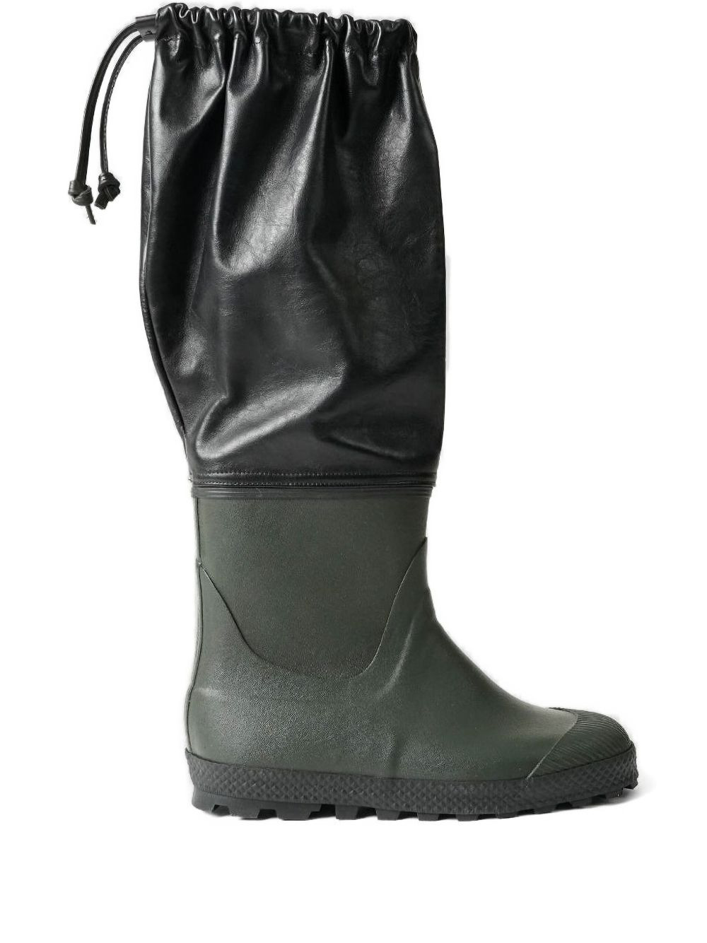 leather-top rain boots Highlights - Forest green - Rubber sole - Leather top - Drawstring fastening - Water resistant - Ridged sole Imported Composition Outer: Rubber 100%, Leather 100% Sole: Rubber 100% Lining: Leather 100%, Rubber 100%
