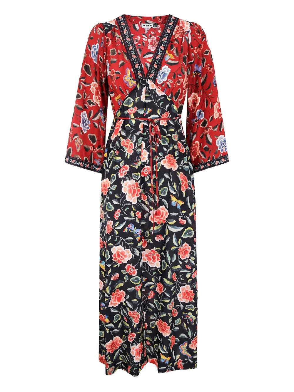 Dahlia silk midi dress Highlights - Black - Floral print - V-neck - 3/4 sleeves - Tie waist Imported Composition Silk 100% Washing instructions Read Manufacturer Guidelines