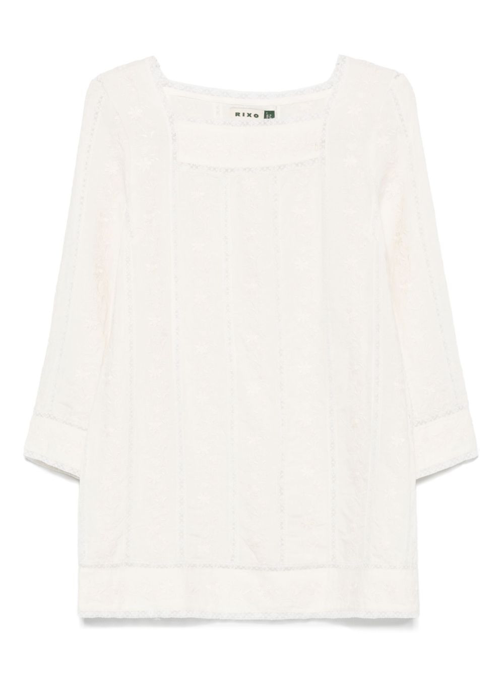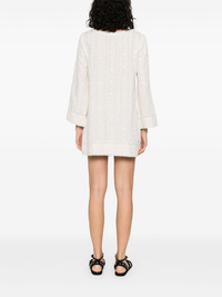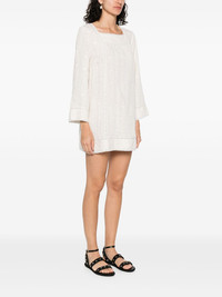 floral-embroidered mini dress Highlights - White - Square neck - Long sleeves - Straight hem Imported Composition Viscose 63%, Linen/Flax 37% SIZE & FIT Model measurements Height 5 ft 10 in(1.79 m) Bust/Chest 33.07 in(84 cm) Hips 35.82 in(91 cm) Waist 24.01 in(61 cm) FittingInformation Designed for a relaxed fit, this piece allows for comfort and movement when worn Made from a lightweight non-stretch fabric Washing instructions Dry Clean Only