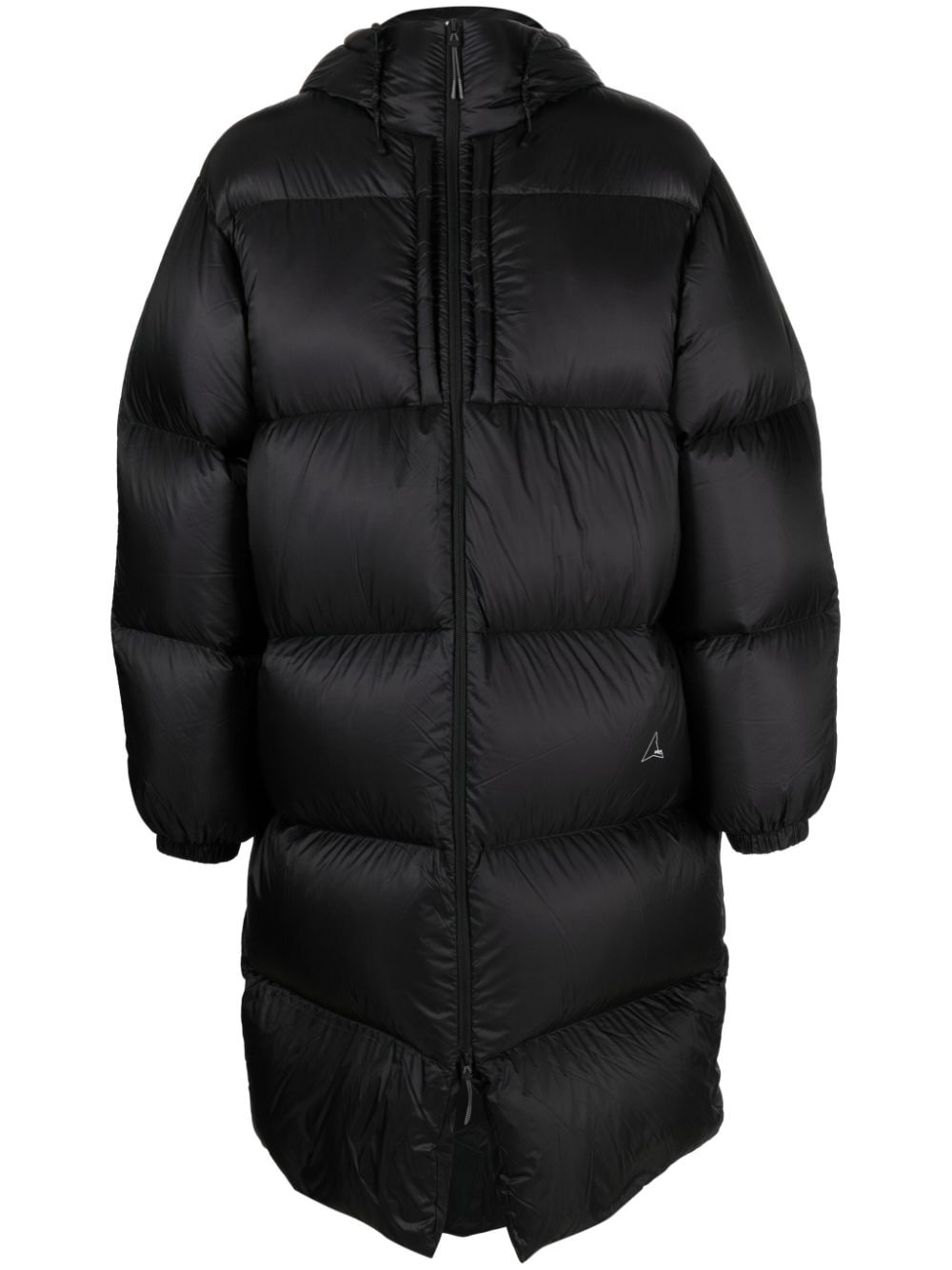 padded hooded jacket Highlights - Black - Padded design - Logo print to the side - Drawstring hood - Long sleeves - Elasticated cuffs - Front two-way zip fastening - Knee-length Imported Composition Polyamide 100% SIZE & FIT Model measurements Height 6 ft 2 in(1.87 m) Bust/Chest 36.41 in(92.5 cm) Hips 35.43 in(90 cm) Waist 29.52 in(75 cm) FittingInformation Designed to be unstructured, offering a loose fit throughout Made from a padded non-stretch fabric, giving it no natural elasticity This piece fits true to size – take your usual size Washing instructions Dry Clean Only