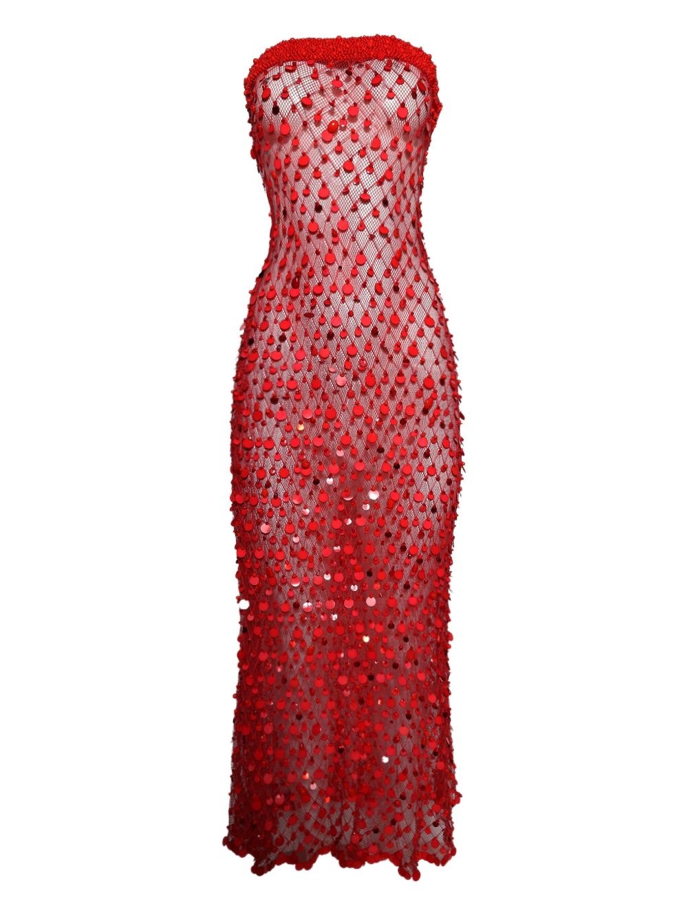 sequin-embellished midi dress Highlights - Ruby red - Semi-sheer construction - Strapless - Flared hem - Mid-length Imported Composition glass 100%, Polyamide 100%