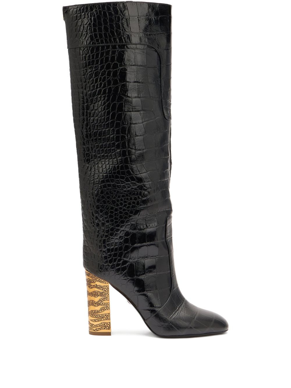 crocodile-effect leather boots Highlights - Black - Crocodile-effect leather - Gold-tone embellishment - High heel - Knee-high shaft - Almond toe Made in Italy Composition Outer: Crocodile Embossed Leather 100% Lining: Calf Leather 100% Sole: Calf Leather 100%