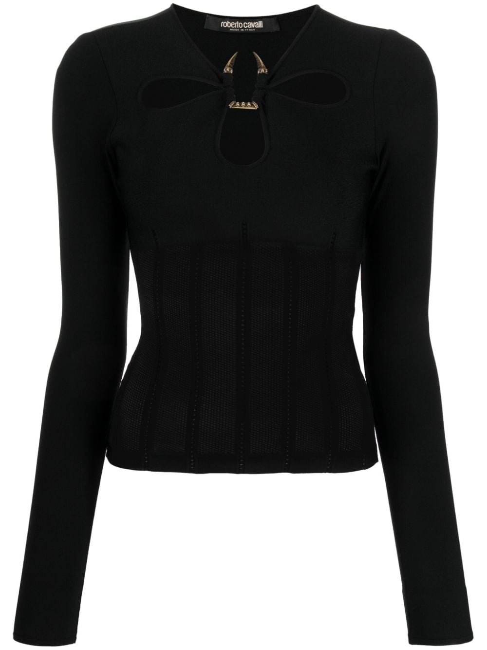 cut-out knit top Highlights - Black - Knitted construction - Cut-out detailing - Fang hardware detail - Semi-sheer construction - Round neck - Long sleeves - Straight hem Made in Italy Composition Viscose 82%, Polyester 16%, Polyamide 2% SIZE & FIT Model measurements Height 5 ft 9 in(1.75 m) Bust/Chest 31.88 in(81 cm) Hips 35.03 in(89 cm) Waist 23.22 in(59 cm) FittingInformation Designed for a close fit throughout Made with a midweight knit, this piece offers some stretch This piece fits true to size – take your usual size