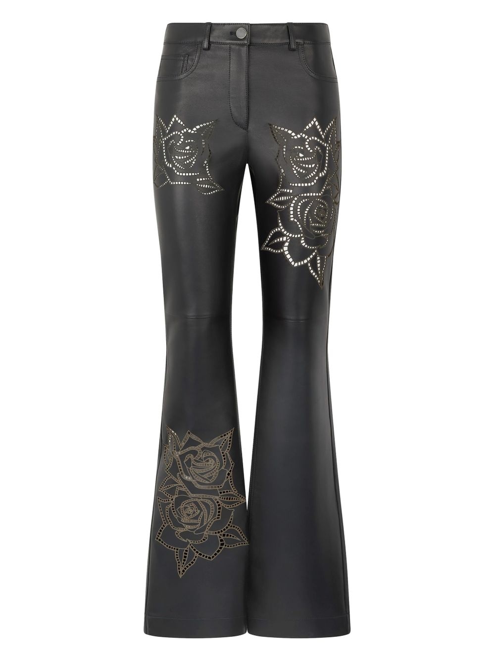 floral-embroidery flared trousers Highlights - Black - Floral embroidery - Flared hem - Front button fastening - Belt loops - Back pockets - High-rise waist - Smooth finish Imported Composition Lamb Skin 100% Washing instructions Specialist Cleaning