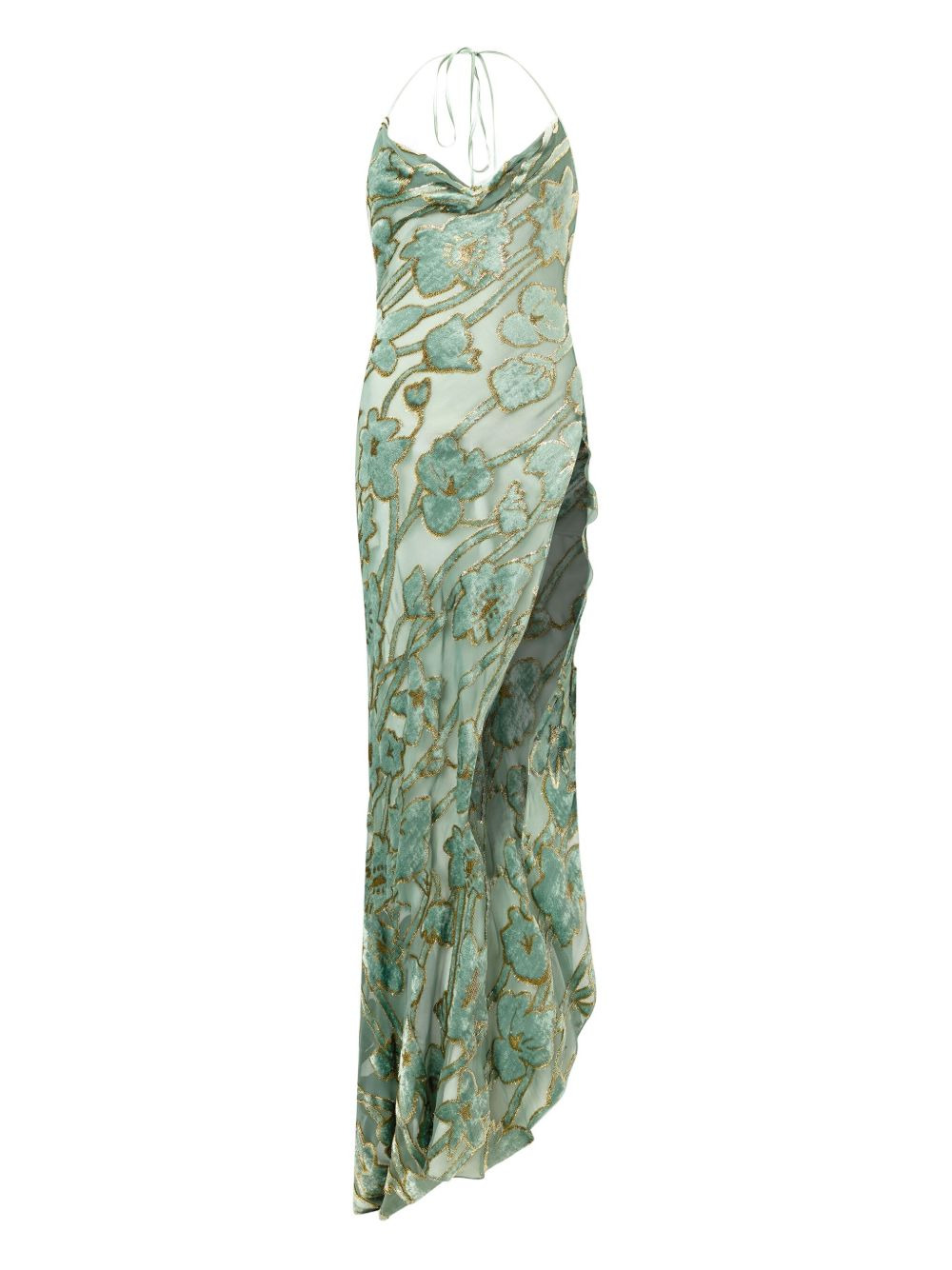 floral-pattern asymmetrical dress Highlights - Sage green - Floral pattern - Cowl neck - Asymmetrical hemline - Rear tie-fastening Imported Composition Fabric 100%