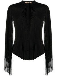 fringe cuffs tie-collar shirt black fringe detailing side slit gathered tie neck classic collar long sleeves front button fastening curved hem Made in Italy Composition Viscose 100% SIZE & FIT Measurement WAIST 32 in(81.3 cm) BUST 32 in(81.3 cm) Washing instructions Dry Clean Only