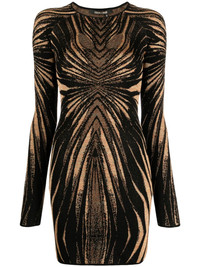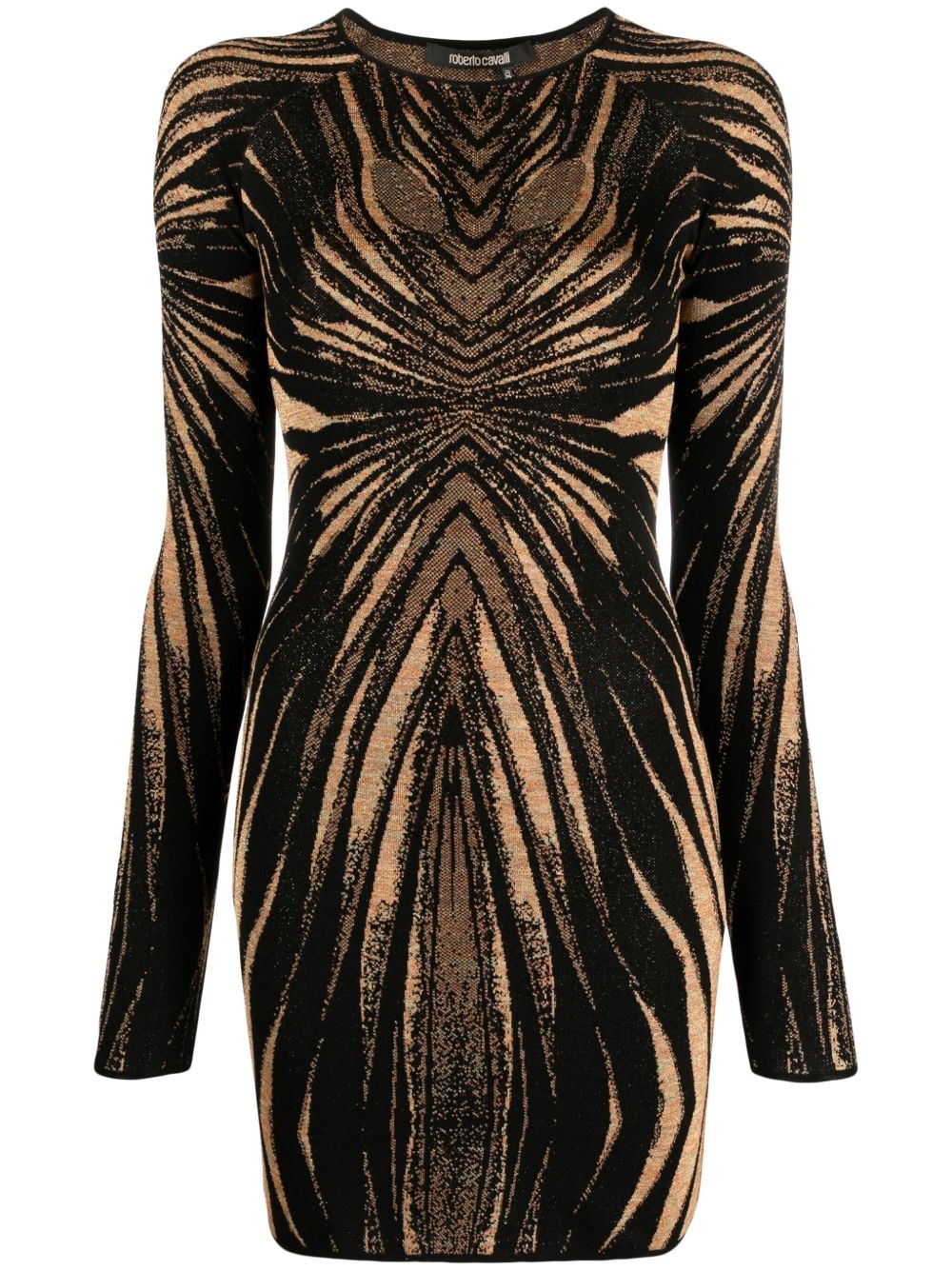 graphic-print mini dress This Roberto Cavalli minidress draws inspiration from the season’s muse, Georgia O'Keeffe, and her American Southwest stomping grounds. It’s jacquard woven with metallic threads to create an artful and abstract pattern in a earthy sand-beige hue. Covert cut-outs at the decolletage shows a subtle flash of skin. Highlights - Black/light brown - Metallic threading - Patterned jacquard - Cut-out detailing - Crew neck - Long sleeves - Straight hem - Thigh-length Made in Italy Composition Viscose 83%, Metallic Fibre 10%, Polyester 7% SIZE & FIT Model measurements Height 5 ft 11 in(1.8 m) Bust/Chest 34.25 in(87 cm) Hips 35.82 in(91 cm) Waist 24.8 in(63 cm)