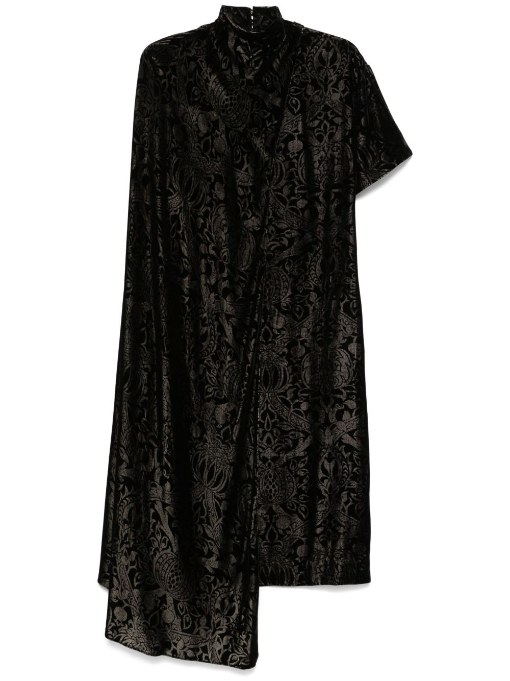 jacquard midi dress Highlights - Black - Velvet effect - Patterned jacquard - Rear button fastening - Draped panel detail - Mock neck - Short sleeves - Two side slit pockets - Shift style - Keyhole detail to the rear - Straight hem - Mid-length Made in Italy Composition Outer: Viscose 82%, Silk 18% Lining: Viscose 100% SIZE & FIT Model measurements Height 5 ft 9 in(1.75 m) Bust/Chest 34.64 in(88 cm) Hips 36.61 in(93 cm) Waist 26.37 in(67 cm) FittingInformation Designed for a relaxed fit, this piece allows for comfort and movement when worn Made from a midweight non-stretch fabric Washing instructions Dry Clean Only
