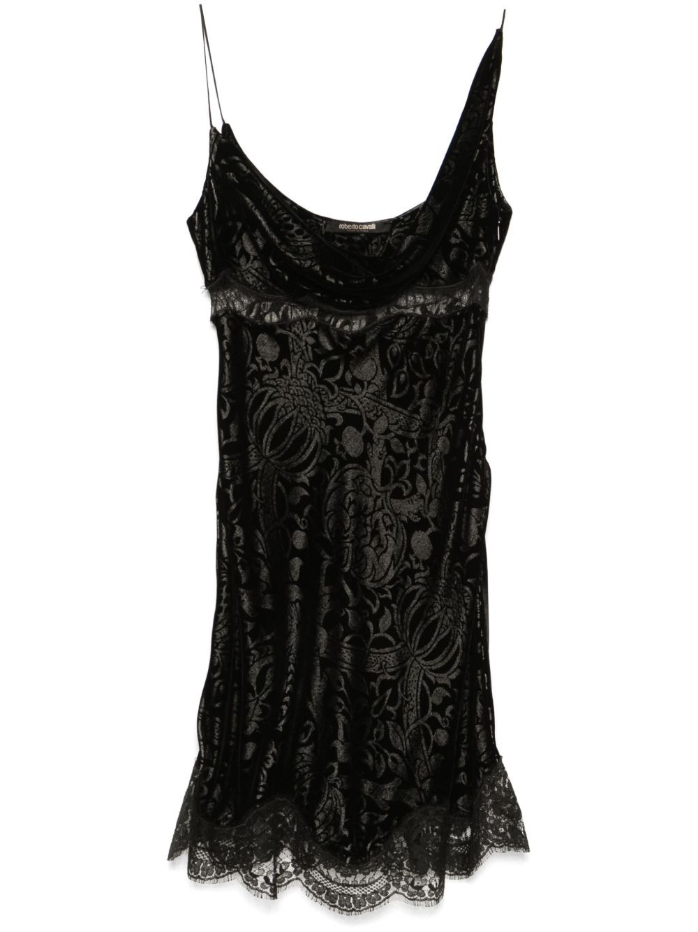 jacquard mini dress Highlights - Black - Velvet effect - Patterned jacquard - Side zip fastening - Cowl neck - Spaghetti straps - Floral-lace detailing - Slip silhouette - Scallop hem - Above-knee length Made in Italy Composition Viscose 82%, Silk 18% SIZE & FIT Model measurements Height 5 ft 9 in(1.75 m) Bust/Chest 34.64 in(88 cm) Hips 36.61 in(93 cm) Waist 26.37 in(67 cm) FittingInformation Designed for a slim fit that sits just away from the body offering a close yet comfortable fit Made from a midweight non-stretch fabric Washing instructions Dry Clean Only