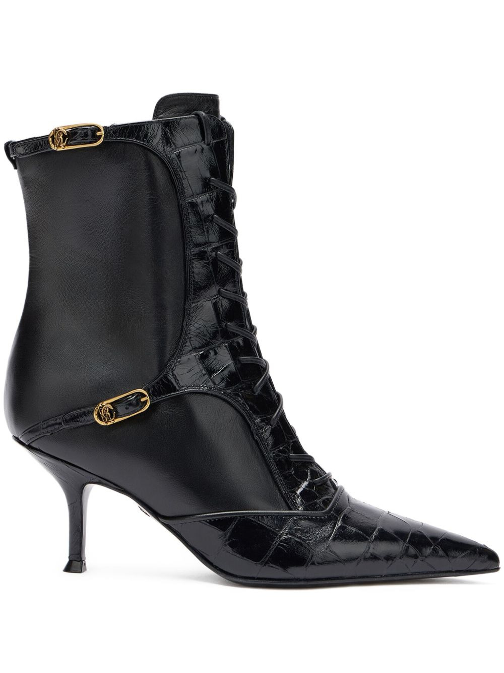 lace-up crocodile-effect ankle boots Highlights - Black - Crocodile effect - Lace-up front - Pointed toe - Buckle detail - Stiletto heel Made in Italy Composition Lining: Leather 100% Sole: Leather 100% Outer: Leather 100%