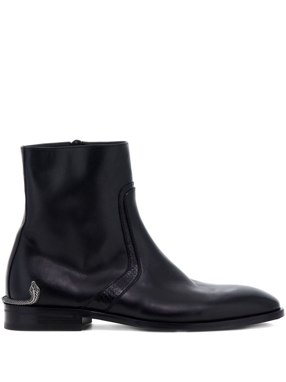 leather ankle boots Highlights - Black - Side zip fastening - Decorative plaque - Branded insole - Almond toe Made in Italy Composition Sole: Bos Taurus 80%, Elastodiene 20% Lining: Goat Skin 100% Outer: Bos Taurus 100%
