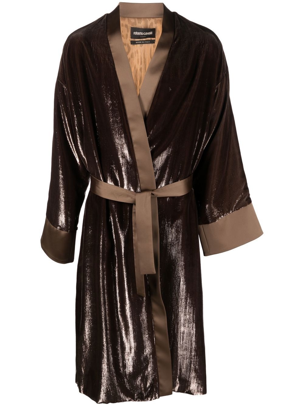 metallic-effect kimono jacket brown metallic finish shawl lapels wrap design long sleeves tied waist straight hem Made in Italy Composition Polyamide 100% SIZE & FIT Model measurements Height 6 ft 2 in(1.87 m) Bust/Chest 36.22 in(92 cm) Hips 37 in(94 cm) Waist 27.95 in(71 cm) FittingInformation This piece fits true to size. We recommend you get your regular size Cut for a loose fit Made with a mid-weight non-stretch fabric