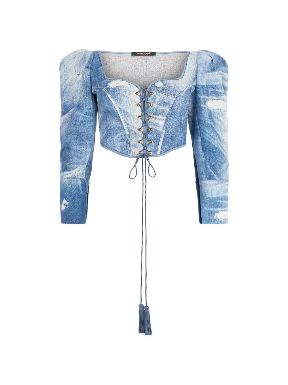 patchwork-effect corset top Highlights - Blue - Graphic pattern - Sweetheart neck - Long sleeves - Tassel detail Imported Composition Fabric 100% Washing instructions Read Manufacturer Guidelines