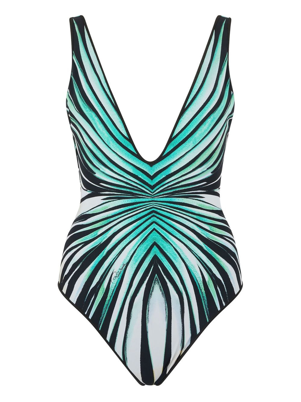 plunge neck Ray Of Sea print swimsuit Highlights - Black and teal - Deep v neckline - Ray of sea print - Wide shoulder straps - High leg cut - Be mindful to try on swimwear over your own garments. Made in Italy Composition Fabric 100% Washing instructions Read Manufacturer Guidelines