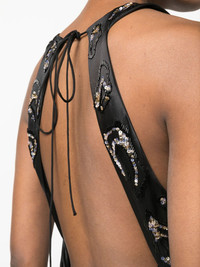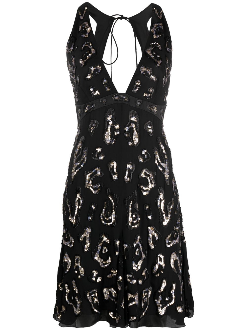sequin-embellished open-back dress black silk sequin embellishment plunging V-neck sleeveless rear tie fastening open back above-knee length flared skirt straight hem Imported Composition Outer: Silk 100% Lining: Silk 100% SIZE & FIT Model measurements Height 5 ft 11 in(1.8 m) Bust/Chest 31.49 in(80 cm) Hips 36.61 in(93 cm) Waist 24.4 in(62 cm)