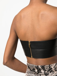 strapless leather bandeau top Roberto Cavalli takes a step back from its usual use of striking patterns to present this bandeau top for SS23. Crafted in black leather, it has a panelled design and rear zip fastening for easier use. Highlights - Black - Calf leather - Panelled design - Rear zip fastening - Strapless - Cropped Made in Italy Composition Calf Leather 100% SIZE & FIT Model measurements Height 5 ft 11 in(1.8 m) Bust/Chest 31.49 in(80 cm) Hips 36.61 in(93 cm) Waist 24.4 in(62 cm) FittingInformation Designed for a very close and sculpting fit Firm leather offering little flexibility to maintain its durability and sturdiness This piece fits true to size – take your usual size Washing instructions Specialist Cleaning
