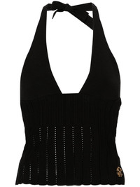 V-neck crop top Highlights - Black - Knitted construction - Gold-tone logo plaque - V-neck - Halterneck tie fastening - Sleeveless - Straight hem - Cropped Made in Italy Composition Viscose 83%, Polyester 17% SIZE & FIT Model measurements Height 5 ft 10 in(1.78 m) Bust/Chest 33.46 in(85 cm) Hips 36.22 in(92 cm) Waist 23.22 in(59 cm) FittingInformation Designed for a close fit throughout The tie fastening neckline offers a more secure fit allowing for adjustability Made with a midweight knit, this piece offers some stretch This piece fits true to size – take your usual size