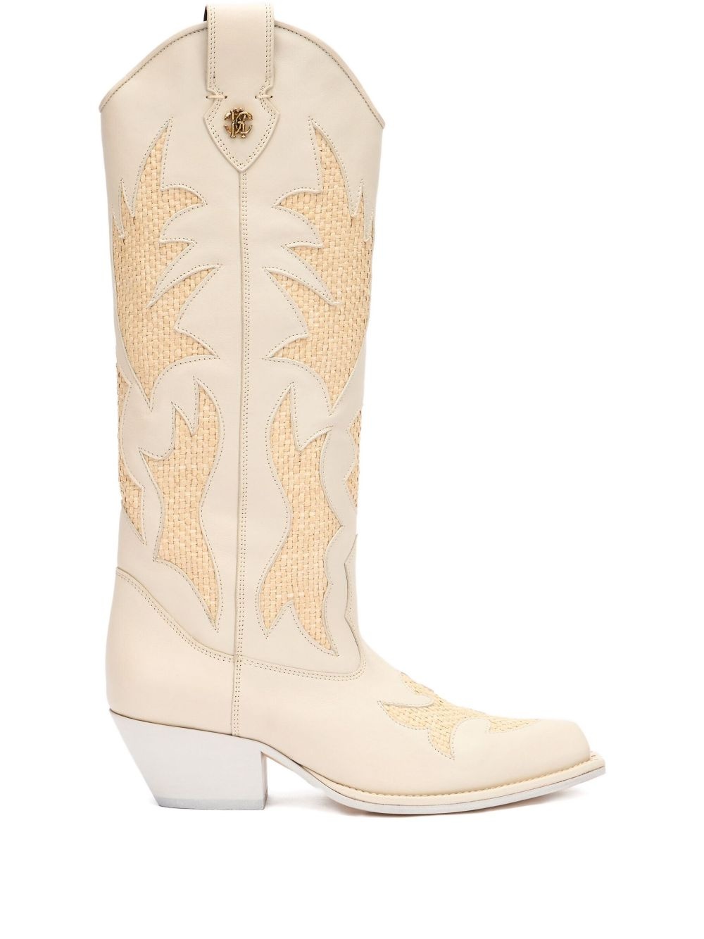Western-inspired embroidered boots Highlights - Embroidered motifs - Decorative stitching - Contrasting heel - Beige - Slip-on style Imported Composition Sole: Calf Leather 100% Lining: Fabric 100% Outer: Fabric 100%, Calf Leather 100%