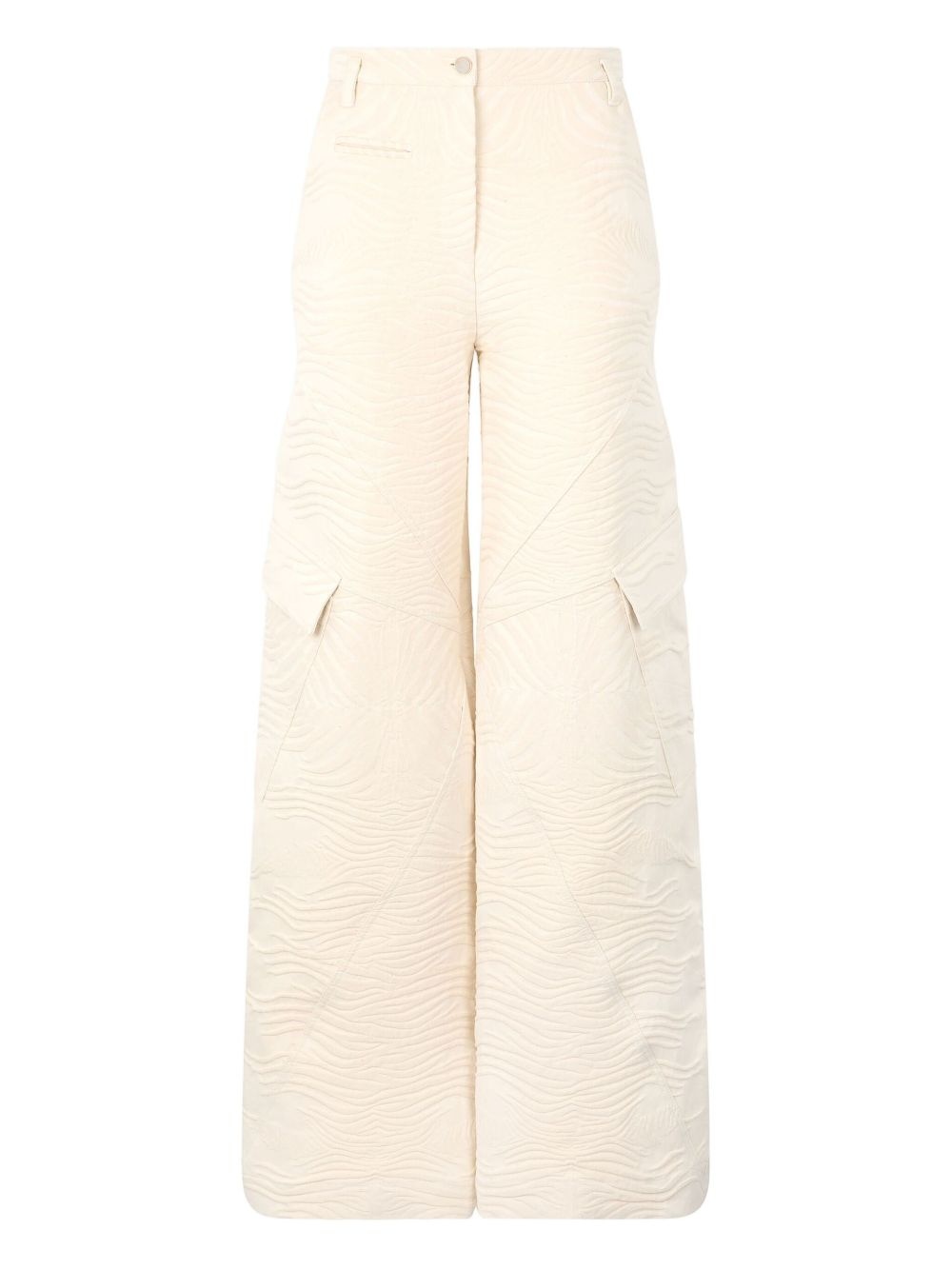 zebra-jacquard cargo trousers Highlights - Light beige - Concealed fly and button fastening - Two side slit pockets - Two side cargo pockets - Two rear flap pockets Imported Composition Lining: Viscose 55%, Polybutylene Terephthalate (PBT) 45% Outer: Cotton 100% Washing instructions Dry Clean Only