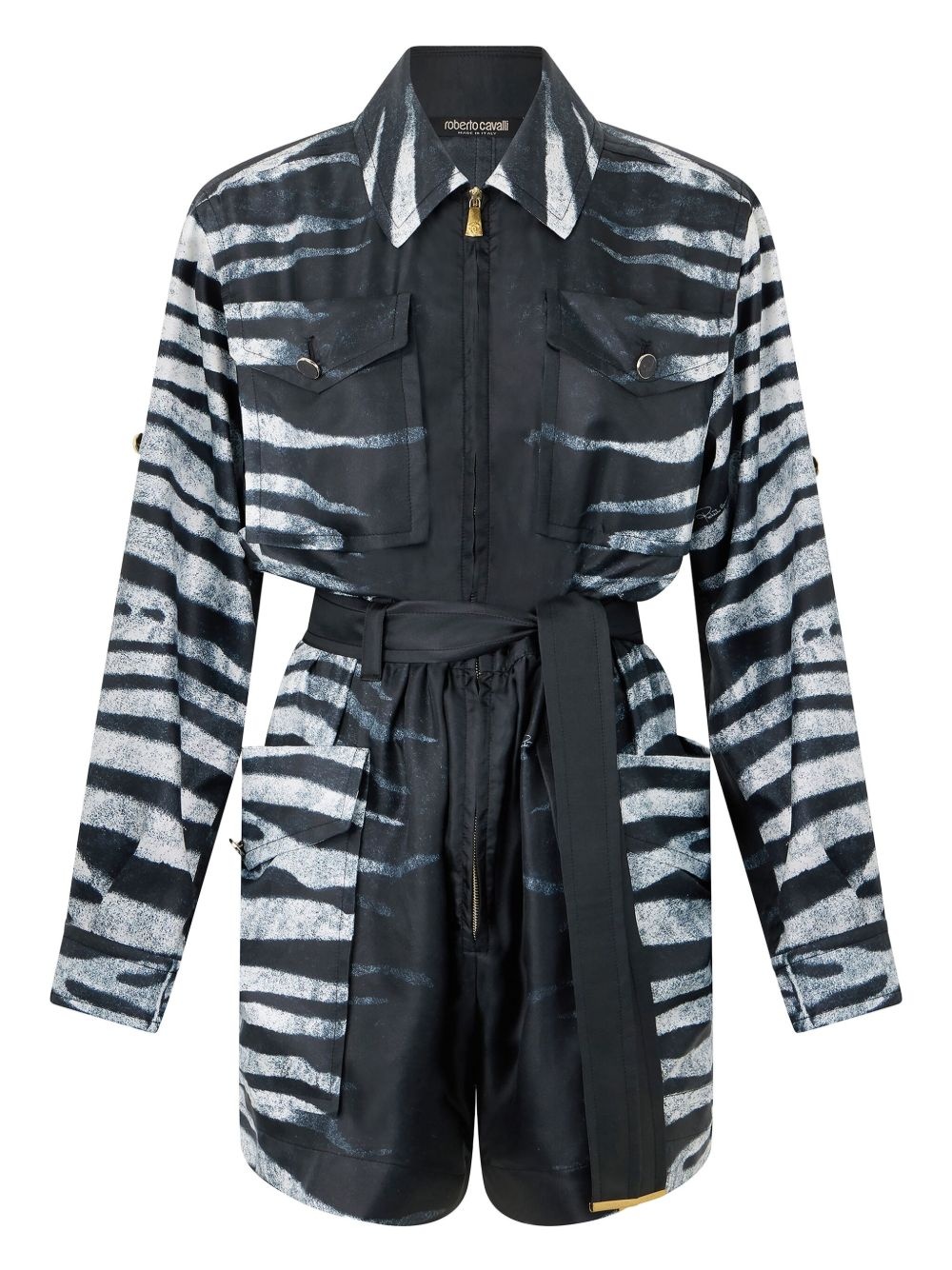zebra-print jumpsuit Highlights - Black - Front zip fastening - Two chest flap pockets - Two side patch pockets - Classic collar Made in Italy Composition Silk 100%