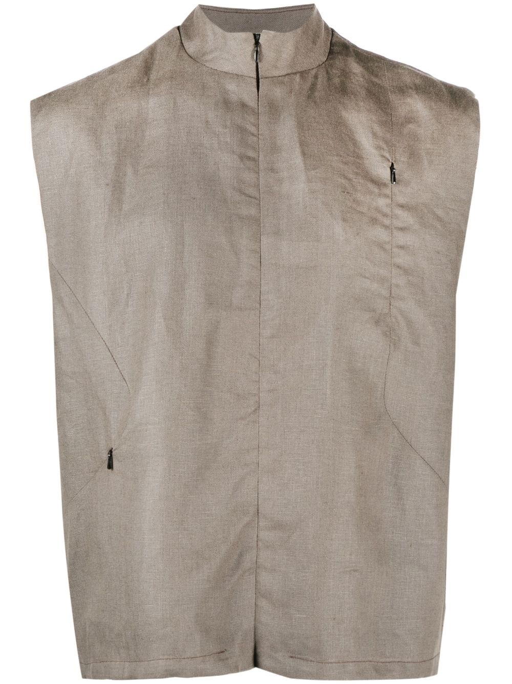 band-collar zip-up gilet Highlights - Rust brown - Band collar - Front zip fastening - Zip-fastening chest pocket - Side zip-fastening pocket - Sleeveless - Straight hem Imported Composition Outer: Linen/Flax 100% Lining: Recycled Polyethylene 100% SIZE & FIT Model measurements Height 6 ft 2 in(1.87 m) Bust/Chest 38.18 in(97 cm) Hips 36.61 in(93 cm) Waist 29.13 in(74 cm) FittingInformation Designed for a relaxed fit, this piece allows for comfort and movement when worn Made from a midweight non-stretch fabric This piece fits true to size – take your usual size
