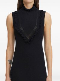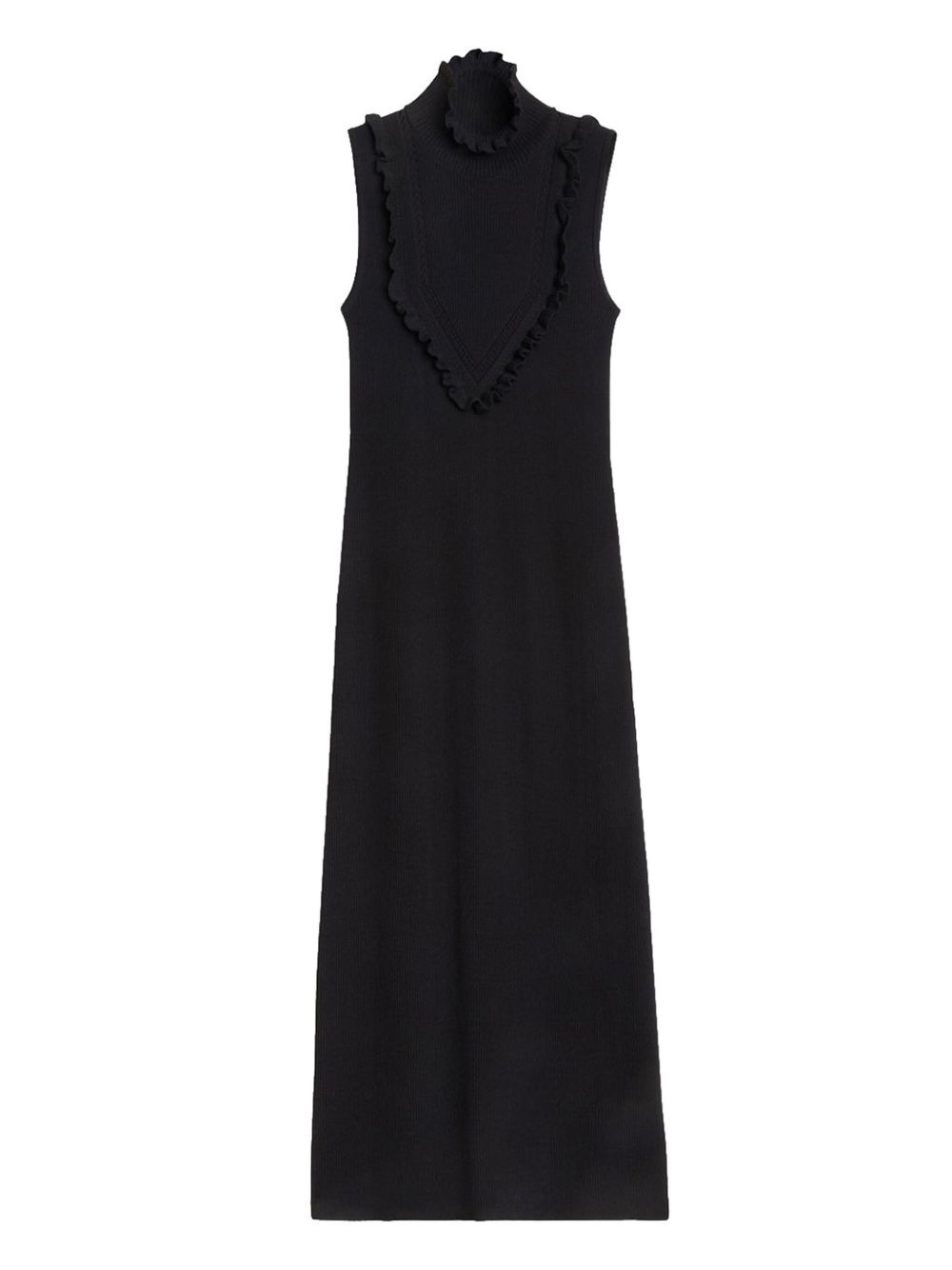 ribbed ruffle maxi dress Highlights - Black - Ribbed knit - High neck - Sleeveless - V-shaped ruffle detail - Open knit ruffle trim Imported Composition Viscose 89%, Nylon 11% Washing instructions Read Manufacturer Guidelines