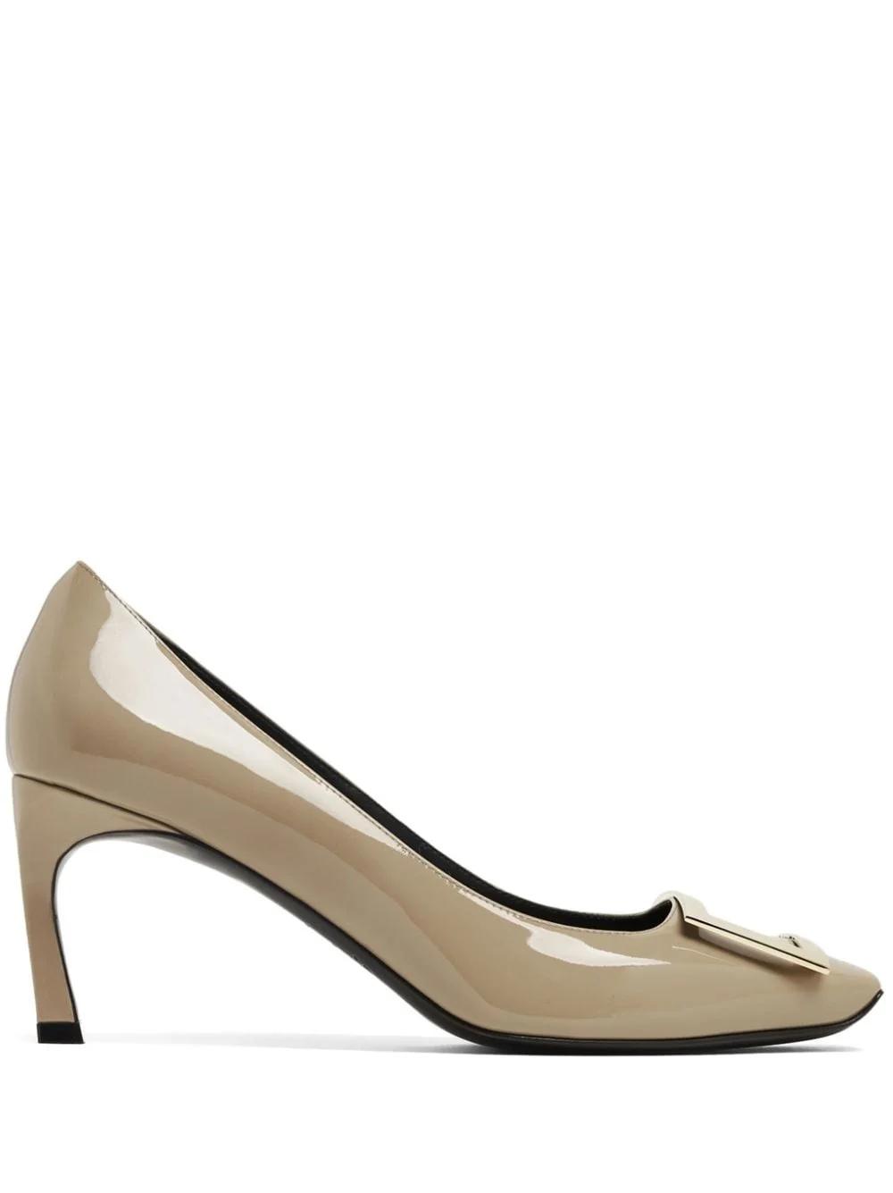 65mm Trompette leather pumps Highlights - Almond beige - Calf leather - Patent finish - Decorative buckle detailing - Square toe - Slip-on style - 65mm stiletto heel Made in Italy Composition Outer: Patent Leather 100% Sole: Calf Leather 100% Lining: Calf Leather 100%