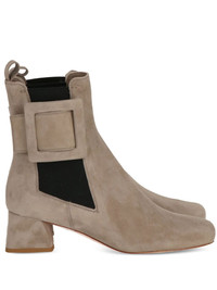 buckle-detail suede boots Highlights - Beige - Suede - Block heel - Elasticated side panels - Buckle detail Made in France Composition Lining: Calf Leather 100% Sole: Calf Leather 100% Outer: Calf Suede 100%