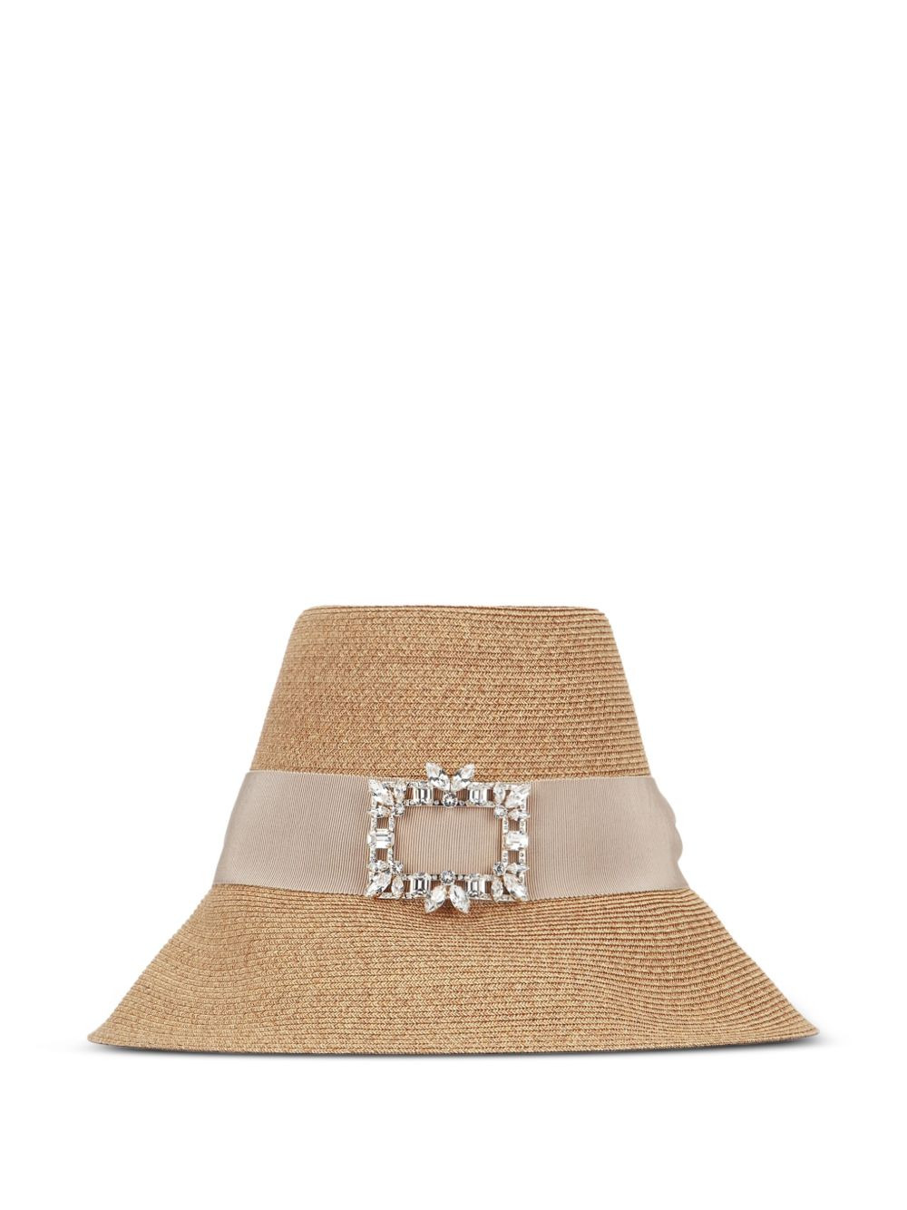 buckle-embellished straw bucket hat Highlights - Beige - Straw weave - Wide brim - Grosgrain ribbon - Crystal-embellished buckle Made in Italy Composition Raffia 100%