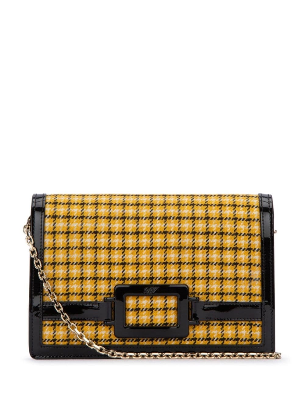 check print clutch bag Highlights - Yellow/black - Canvas/leather - Patent finish - Logo-buckle detail - Chain-link shoulder strap - Foldover top with magnetic fastening - Main compartment Made in Italy Composition Outer: Patent Leather 100%, Fabric 100%
