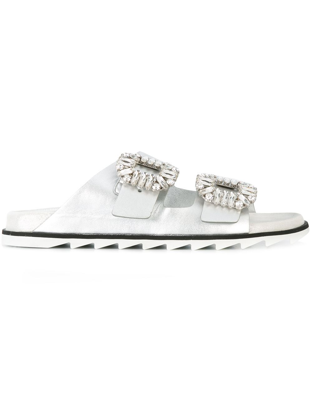 embellished sandals Silver toned leather embellished sandals from Roger Vivier. Made in Italy Composition Outer: glass 100%, Metal (Other) 100%, Calf Leather 100% Sole: Rubber 100% Lining: Calf Leather 100%