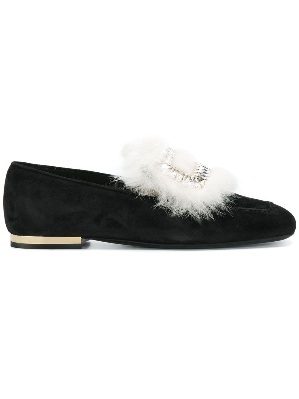 fur detail loafers Black suede fur detail loafers from Roger Vivier. Made in Italy Composition Lining: Calf Leather 100% Sole: Calf Leather 100% Outer: Suede 100% SIZE & FIT Measurement HEEL 0.39 in(1 cm)