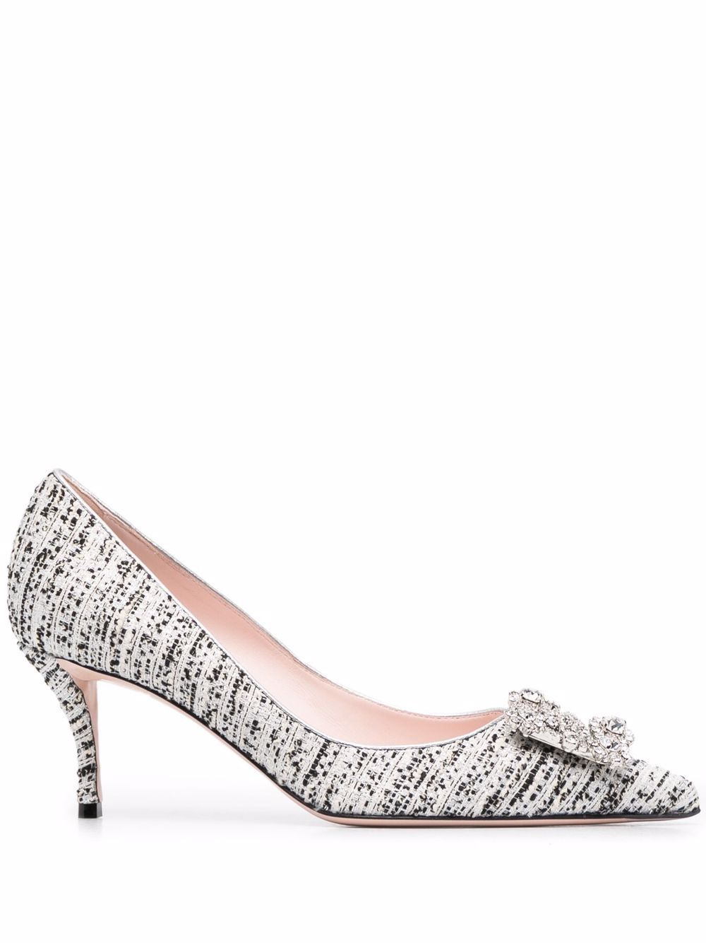 tweed buckled pumps white / black leather tweed decorative buckle detail pointed toe branded insole mid heel Made in Italy Composition Sole: Leather 100% Outer: Fabric 100% Lining: Leather 100% SIZE & FIT Measurement HEEL 2.55 in(6.5 cm)