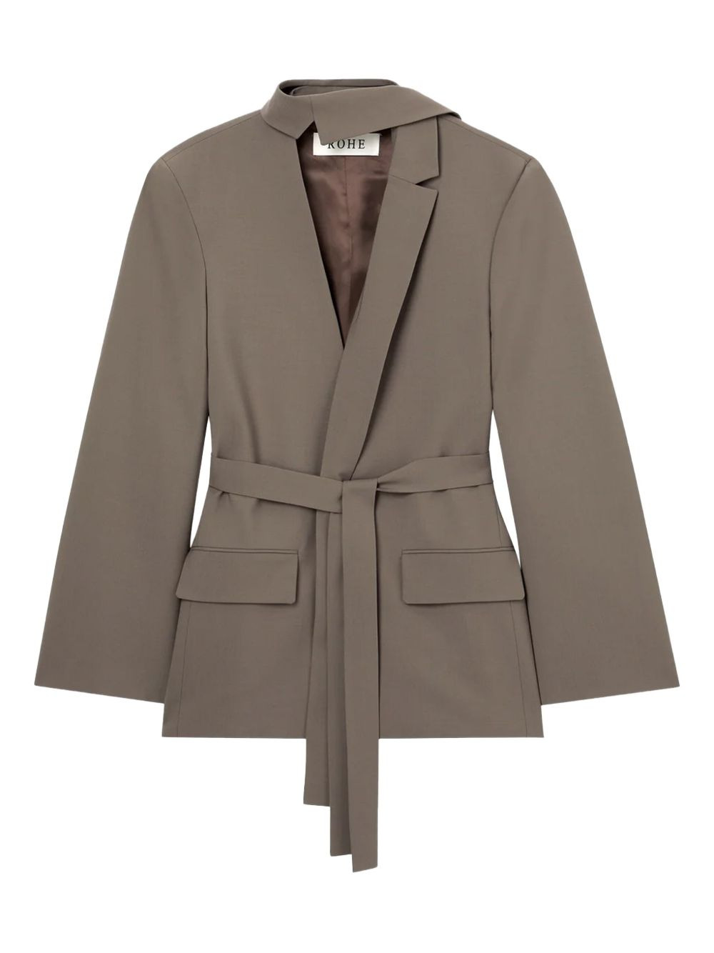 Deconstructed belted blazer Highlights - Light brown - Self-tie belt - Draped neckline - Single button fastening - Long sleeves - Flap pockets Imported Composition Polyester 53%, Virgin Wool 43%, Spandex/Elastane 4% Washing instructions Read Manufacturer Guidelines