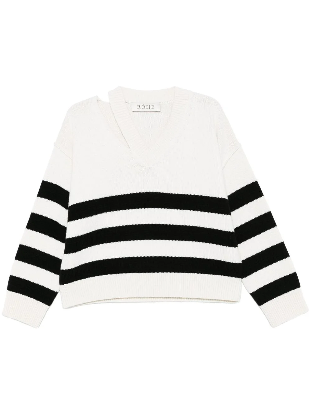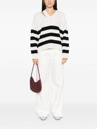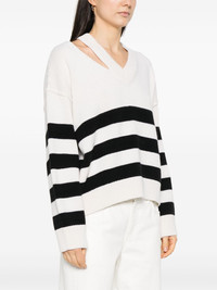 deconstructed V-neck sweater Highlights - White - Drop shoulder - Long sleeves - Cut-out detailing - Horizontal stripe pattern Made in Italy Composition Wool 90%, Cashmere 10% SIZE & FIT Model measurements Height 5 ft 11 in(1.8 m) Bust/Chest 33.07 in(84 cm) Hips 37.4 in(95 cm) Waist 25.19 in(64 cm) FittingInformation Designed to be unstructured, offering a loose fit throughout Made with a midweight knit, this piece offers some stretch