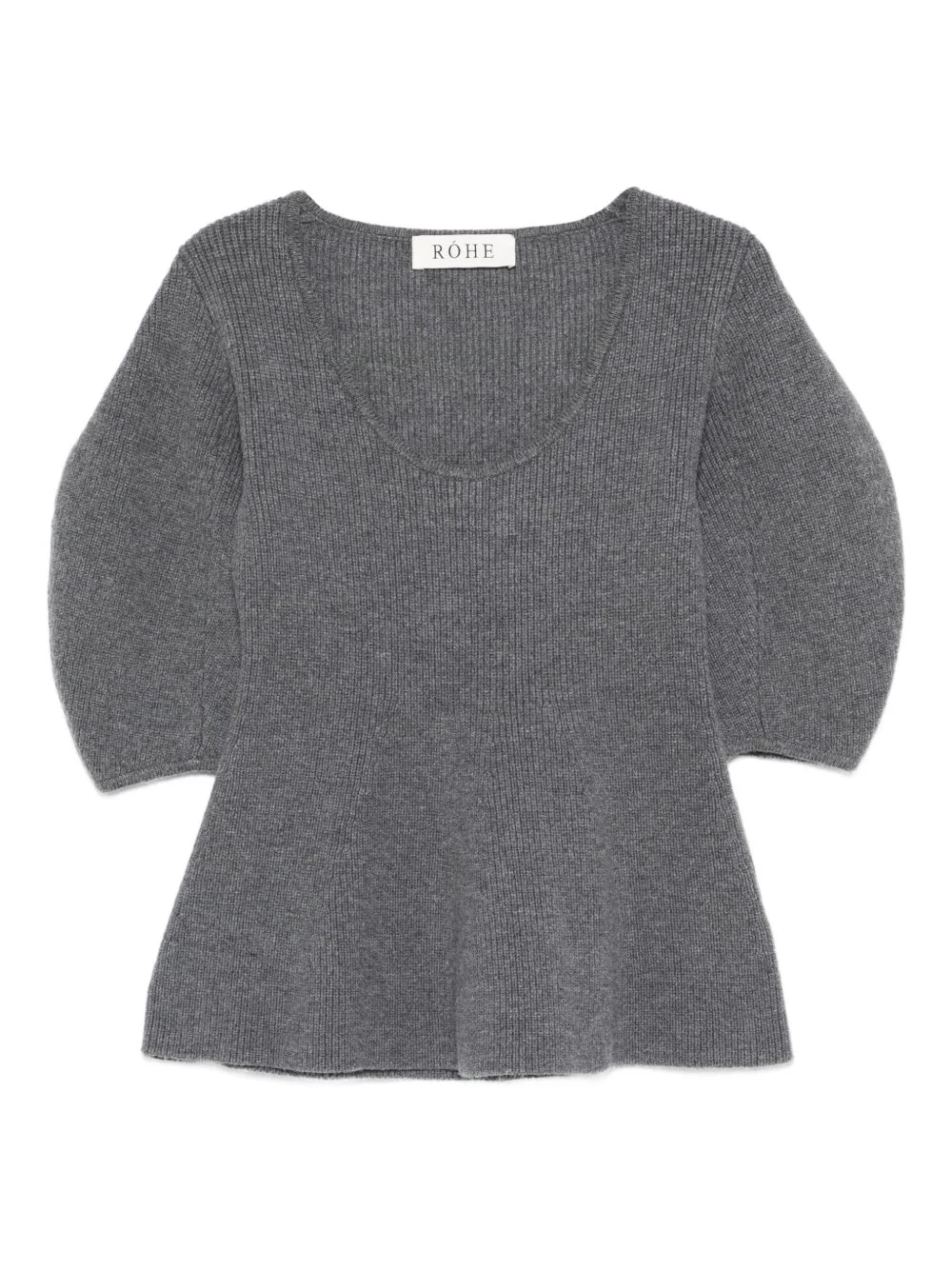 puffed-sleeve knitted top Highlights - Grey - Knitted - Scoop neck - Short puffed sleeves - Ribbed texture Made in Italy Composition Wool 88%, Cashmere 10%, Elastane 2% Washing instructions Dry Clean Only