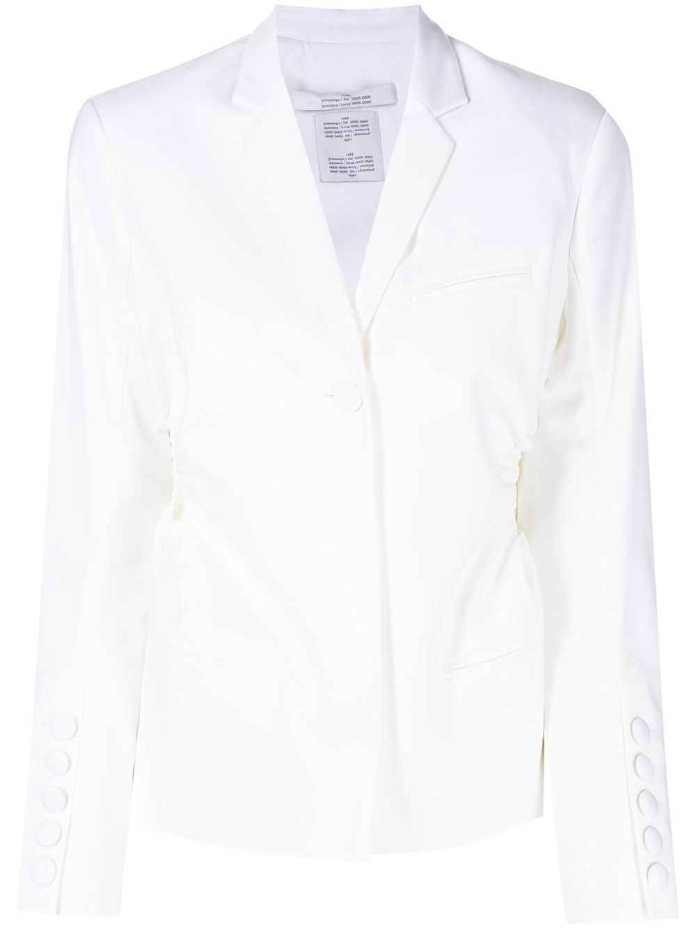 cut out tailored blazer white cut-out detailing notched lapels long sleeves straight hem Imported Composition Polyester 65%, Viscose 35% SIZE & FIT Model measurements Height 5 ft 11 in(1.8 m) Bust/Chest 28.34 in(72 cm) Hips 35.43 in(90 cm) Waist 23.62 in(60 cm) FittingInformation This piece fits true to size. We recommend you get your regular size Cut for a slim fit Made with a mid-weight non-stretch fabric