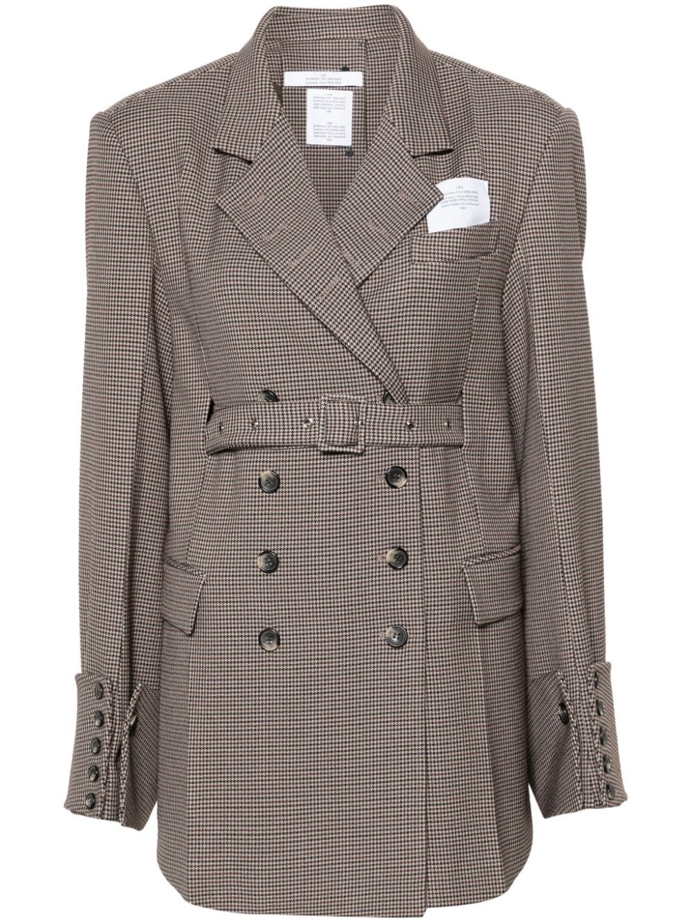 houndstooth double-breasted blazer Highlights - Brown/multicolour - Houndstooth pattern - Notched lapels - Double-breasted button fastening - Rear button fastening - Shoulder pads - Long sleeves - Button-fastening turn-up cuffs - Detachable waist belt - Chest welt pocket - Two front flap pockets - English rear vents - Straight hem - Satin lining Imported Composition Outer: Polyester 61%, Viscose 20%, Fabric 15%, Spandex/Elastane 4% Lining: Polyester 52%, Viscose 48% SIZE & FIT Model measurements Height 5 ft 9 in(1.76 m) Bust/Chest 31.88 in(81 cm) Hips 35.43 in(90 cm) Waist 24.8 in(63 cm) FittingInformation Designed to be unstructured, offering a loose fit throughout The belt offers adjustability for fitted preferences Made from a midweight fabric This piece fits true to size – take your usual size
