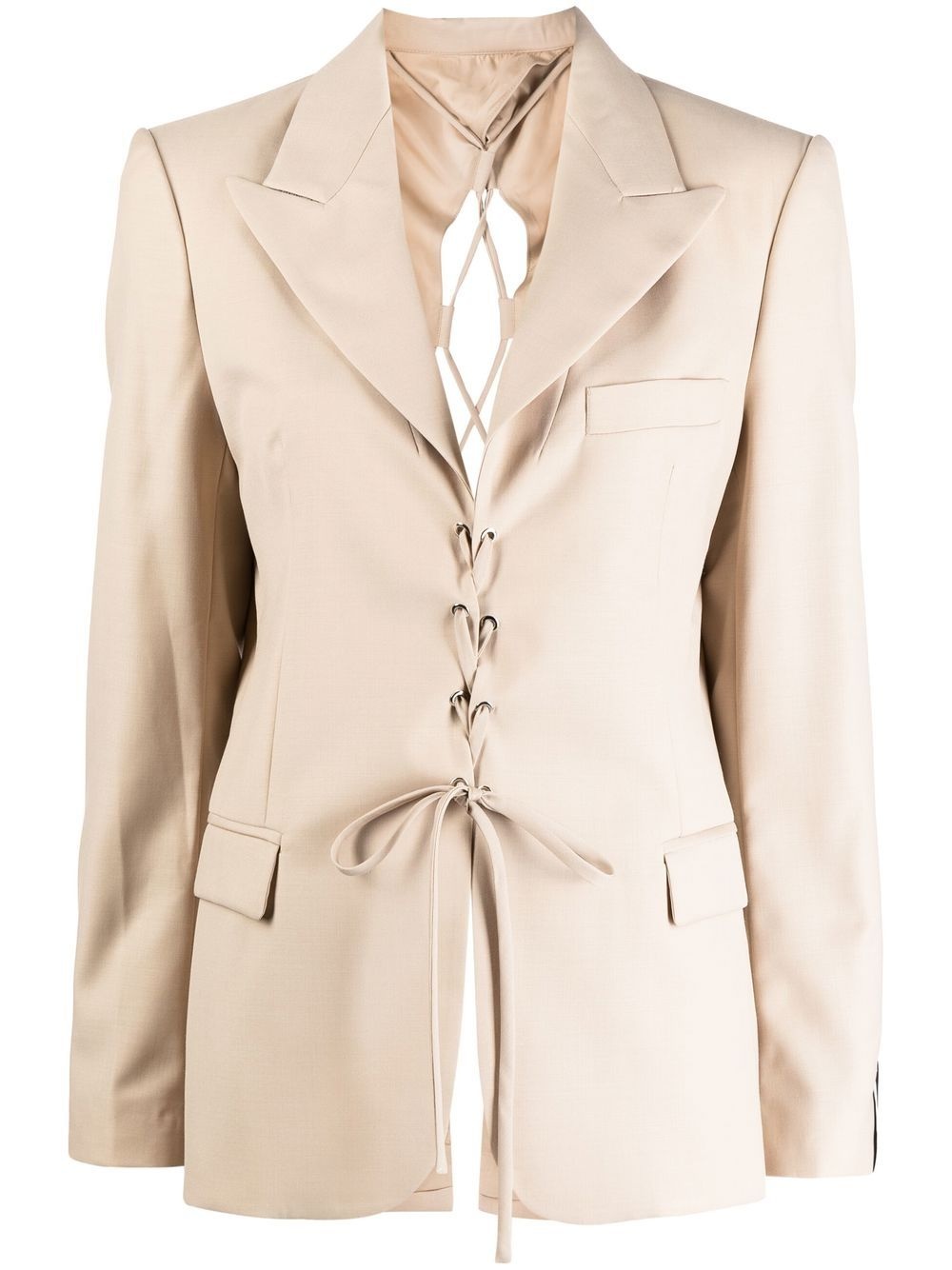 laced open back tailored blazer light brown open back peak lapels front lace-up fastening rear lace-up fastening long sleeves chest welt pocket two side flap pockets Imported Composition Body: Polyester 70%, Wool 30% SIZE & FIT Model measurements Height 5 ft 9 in(1.76 m) Bust/Chest 31.1 in(79 cm) Hips 35.03 in(89 cm) Waist 24.4 in(62 cm) FittingInformation This piece fits true to size. We recommend you get your regular size Cut for a slim fit Made with a mid-weight fabric
