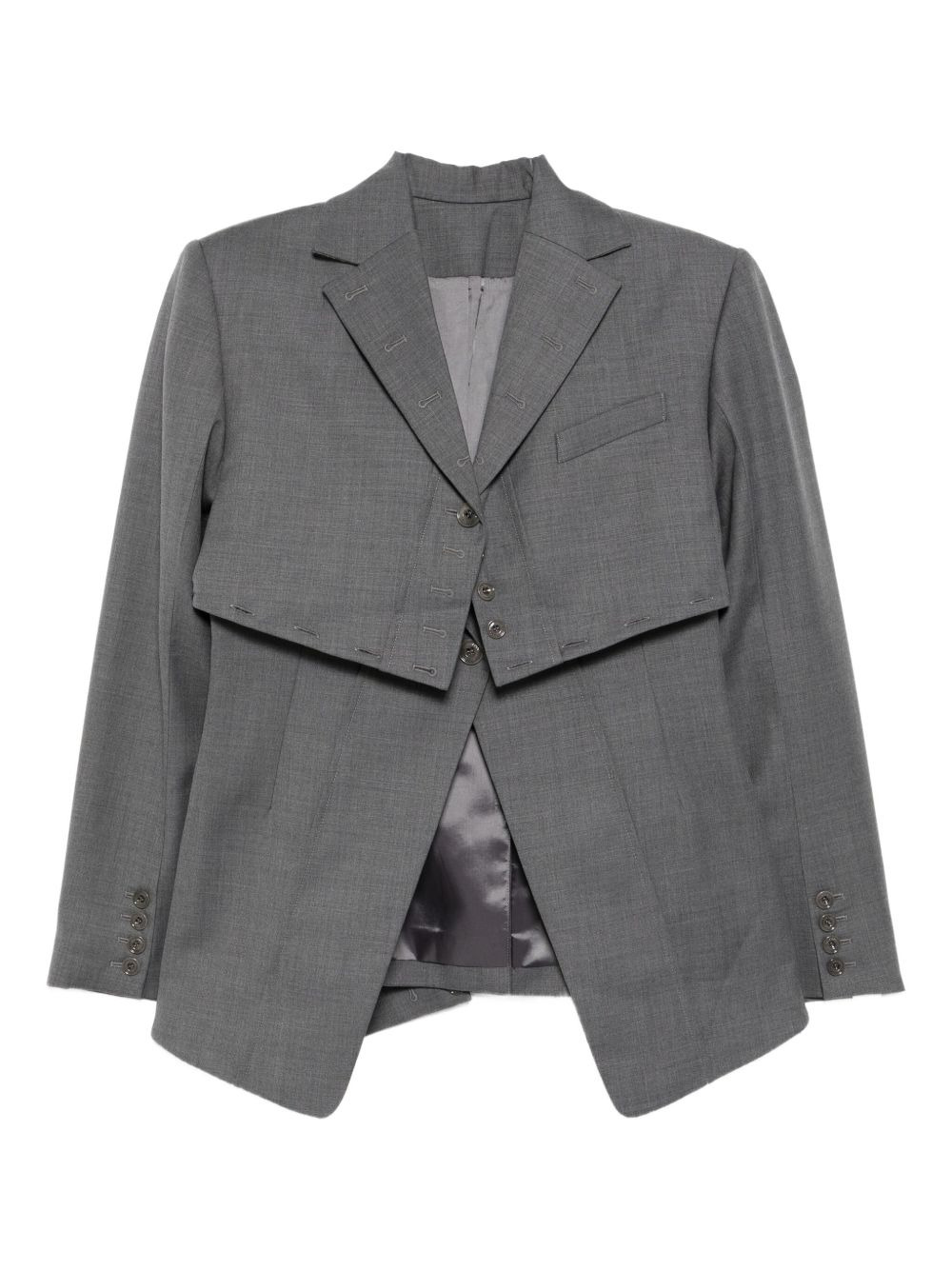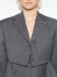 layered broken jacket Highlights - Steel grey - Front button fastening - Layered design - Buttoned cuffs Imported Composition Outer: Wool 60%, Polyester 40% Lining: Polyester 100% SIZE & FIT Model measurements Height 5 ft 10 in(1.78 m) Bust/Chest 31.88 in(81 cm) Hips 37 in(94 cm) Waist 25.19 in(64 cm) FittingInformation Designed for a slim fit that sits just away from the body offering a close yet comfortable fit The internal shoulder pads offer a structured shape Made from a midweight non-stretch fabric Washing instructions Dry Clean Only