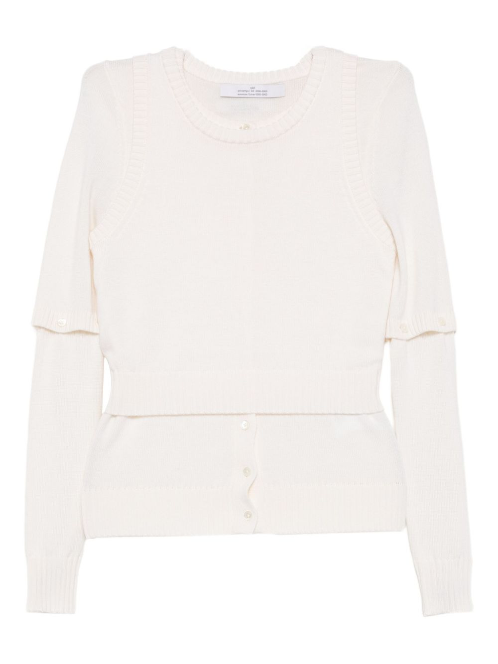 layered cardigan top Highlights - Off-white - Crew neck - Detachable cardigan - Ribbed cuffs and hem Imported Composition Merino 100% SIZE & FIT FittingInformation Designed for a slim fit that sits just away from the body offering a close yet comfortable fit Made with a midweight knit, this piece offers some stretch Washing instructions Dry Clean Only