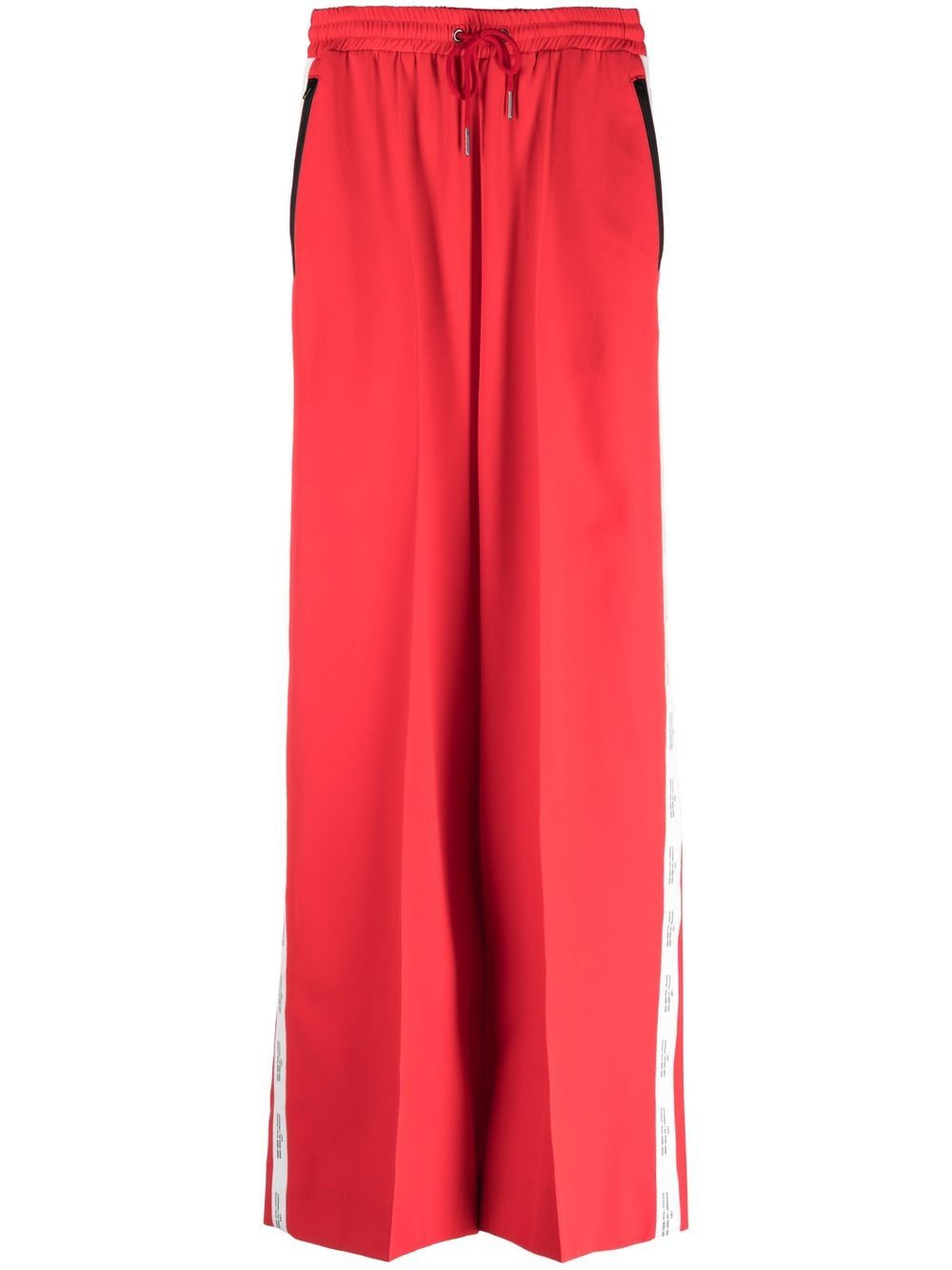 logo-trim palazzo trousers red/white logo trim wide leg elasticated drawstring waistband palazzo design slip pockets to the sides Imported Composition Polyester 80%, Spandex/Elastane 20% SIZE & FIT Model measurements Height 5 ft 11 in(1.8 m) Bust/Chest 33.07 in(84 cm) Hips 37.4 in(95 cm) Waist 25.19 in(64 cm) FittingInformation This piece fits true to size. We recommend you get your regular size Designed to be fitted at the waist and hips, loose over the leg Made with a mid-weight stretch fabric Washing instructions Dry Clean Only