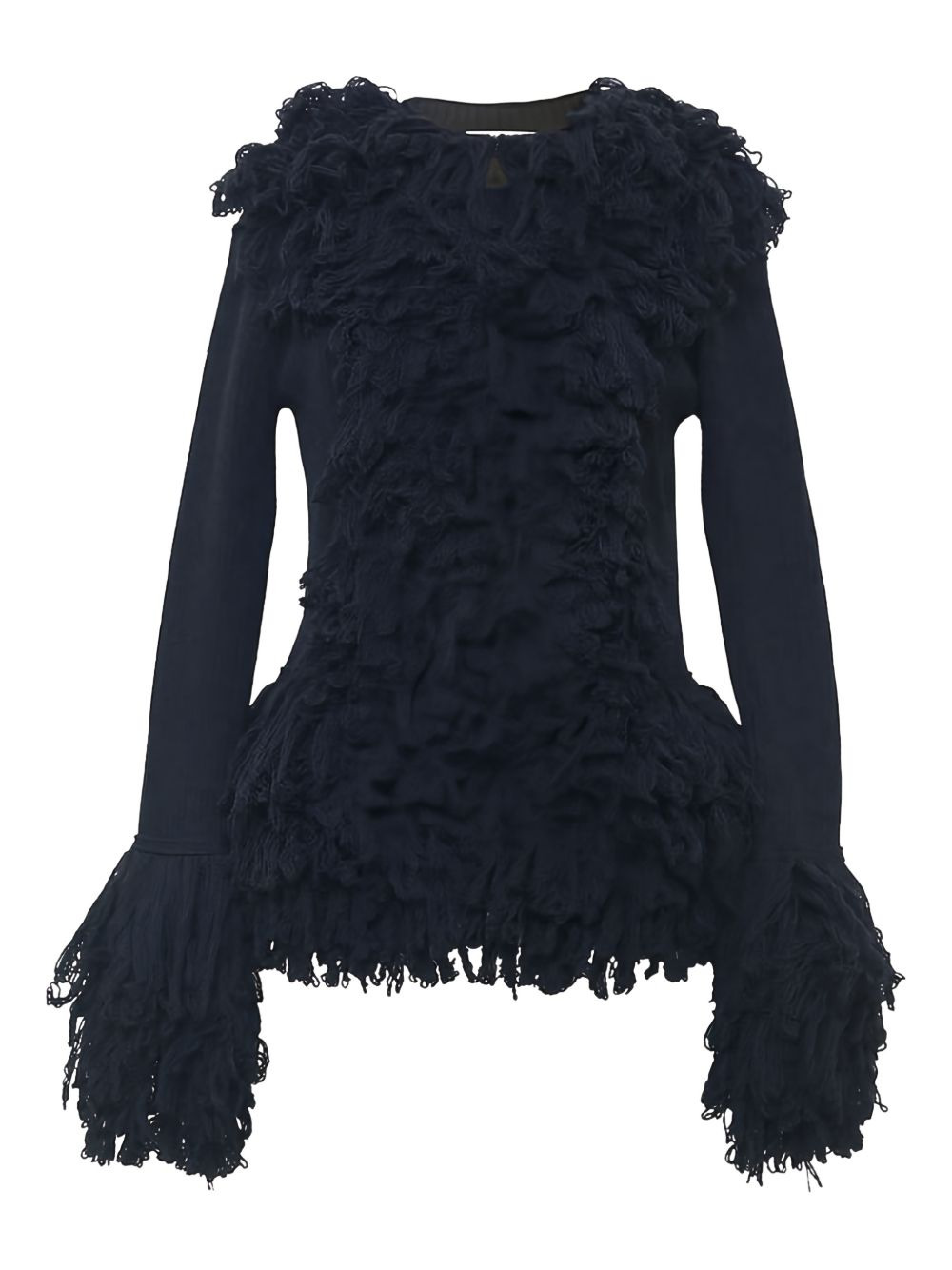 peplum fringed cardigan Highlights - Black - Fringed design - Long sleeves - Crew neck - Zip fastening - Long flounce sleeves - Peplum waist Imported Composition Wool 80%, Nylon 20% Washing instructions Read Manufacturer Guidelines
