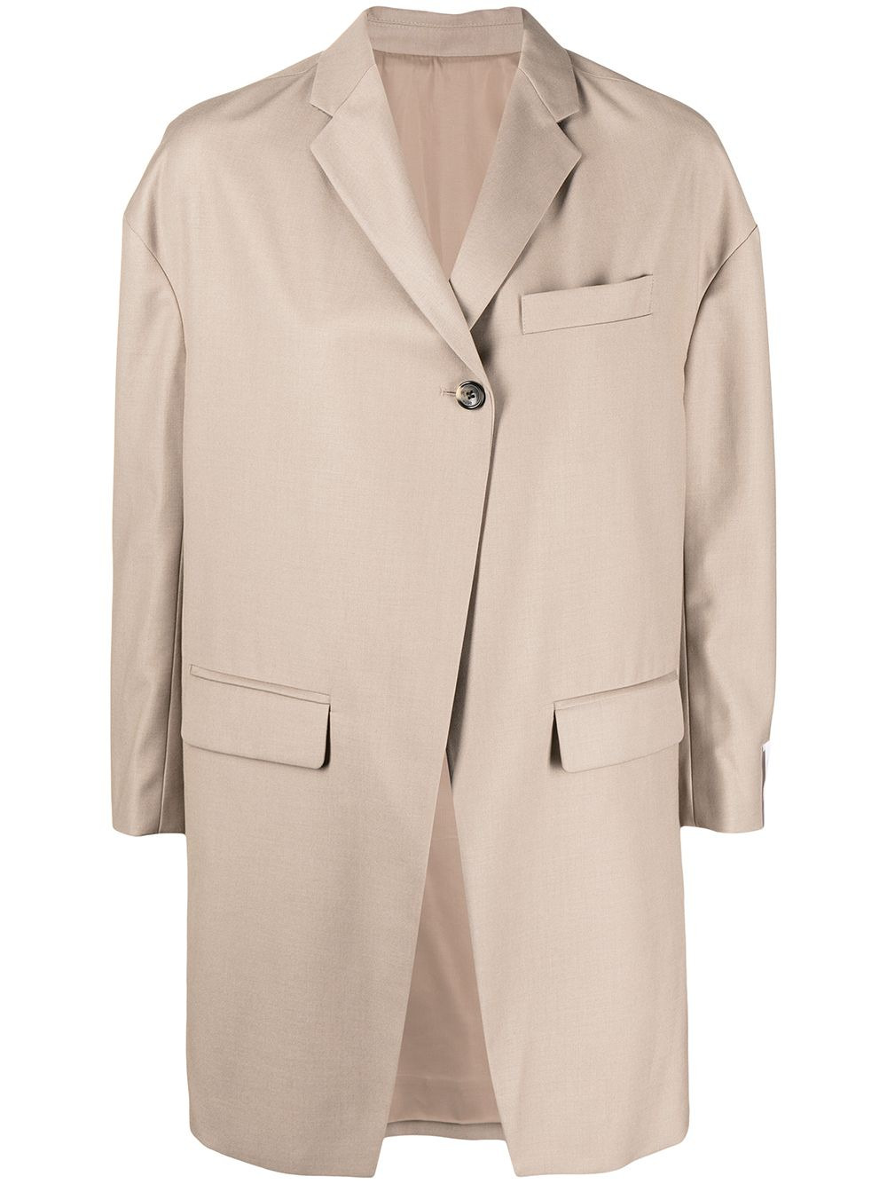 single-breasted asymmetric blazer sand-brown wool-blend front button fastening long sleeves two side flap pockets chest welt pocket asymmetric design Imported Composition Polyester 65%, Rayon 20%, Wool 15% SIZE & FIT Model measurements Height 5 ft 10 in(1.79 m) Bust/Chest 31.49 in(80 cm) Hips 35.03 in(89 cm) Waist 24.01 in(61 cm) FittingInformation This piece fits true to size. We recommend you get your regular size Cut for a loose fit Made with a mid-weight non-stretch fabric Washing instructions Dry Clean Only