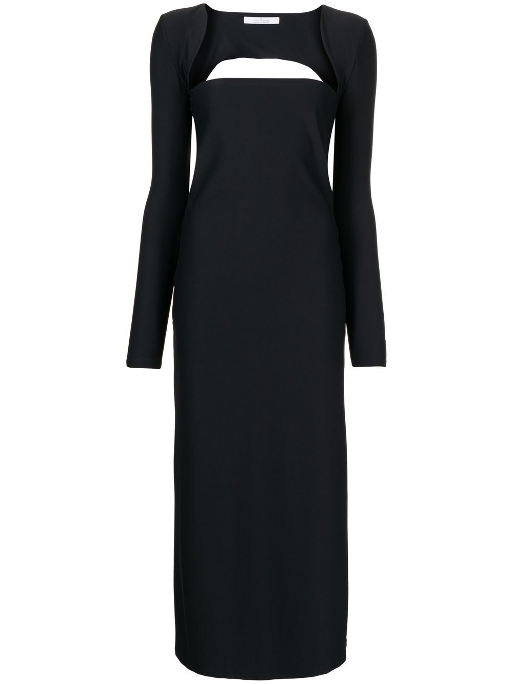 square-neck long-sleeve midi dress square-neck long-sleeve midi dress from ROKH featuring jet black, stretch-design, square neck, long sleeves, open back, rear zip fastening, rear slit and straight hem. Imported Composition Nylon 84%, Polyurethane 16% SIZE & FIT Model measurements Height 5 ft 10 in(1.78 m) Bust/Chest 33.07 in(84 cm) Hips 33.85 in(86 cm) Waist 25.19 in(64 cm) Measurement Shoulder Width 13.38 in(34 cm) LENGTH 50.39 in(128 cm) WAIST 22.04 in(56 cm) BUST 24.4 in(62 cm) FittingInformation This piece fits small – you might want to get one size up Cut for a slim fit Made with a mid-weight stretch fabric