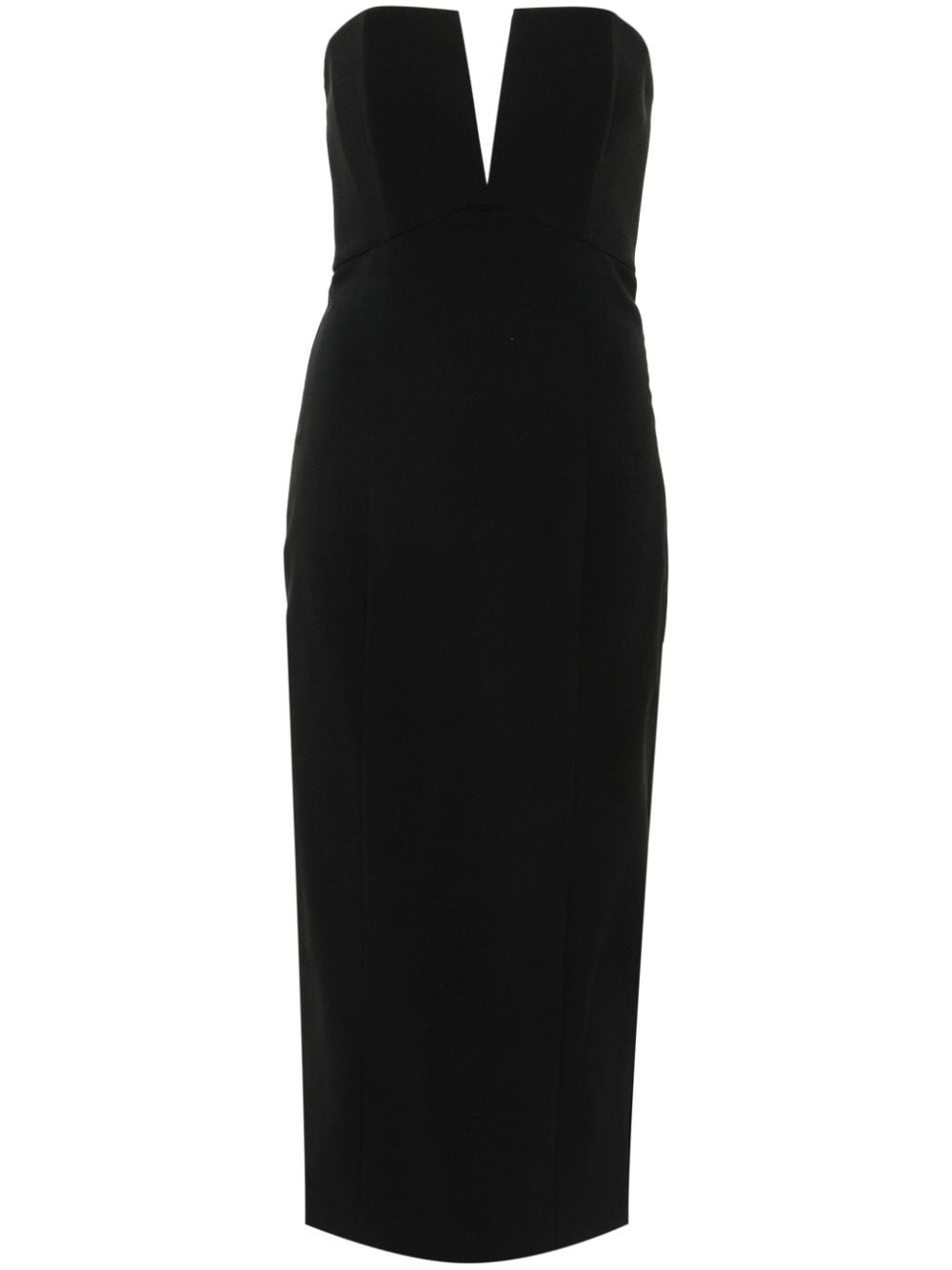 strapless midi dress Highlights - Black - Silk-wool blend - Stretch-design - Cady texture - Boned bodice - Cut-out detailing - Dart detailing - Square neck - Concealed rear hook and zip fastening - Internal rear hook and eye fastening - Strapless - Fitted waistline - Rear slit - Straight hem - Mid-calf length - Full lining Imported Composition Outer: Silk 69%, Wool 29%, Elastane 2% Lining: Polyester 100% SIZE & FIT Model measurements Height 5 ft 9 in(1.75 m) Bust/Chest 34.64 in(88 cm) Hips 36.61 in(93 cm) Waist 26.37 in(67 cm) FittingInformation Designed for a slim fit that sits just away from the body offering a close yet comfortable fit The internal bodice offers support and shape Made from a midweight non-stretch fabric This piece fits true to size – take your usual size Washing instructions Dry Clean Only