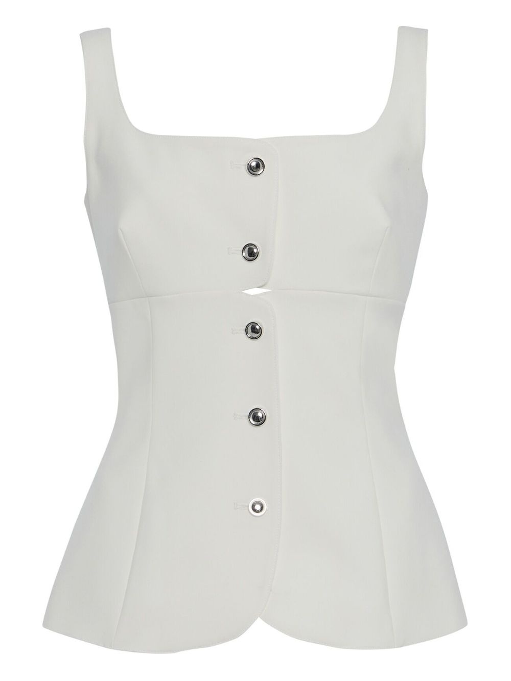 button-front square-neck top Highlights - White - Square neckline - Button front - Sleeveless - Peplum hem Made in United States Composition Polyester 89%, Polyurethane 11% Washing instructions Read Manufacturer Guidelines