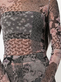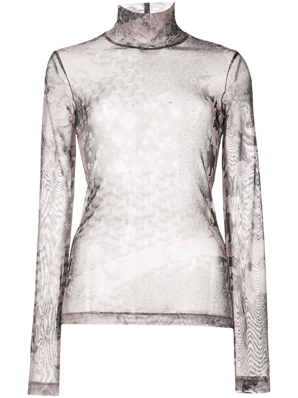 collage-print mesh T-shirt grey sheer collage print roll neck long sleeves stretch-design Made in United States Composition Body: Polyamide 92%, Elastane 8% SIZE & FIT Model measurements Height 5 ft 10 in(1.78 m) Bust/Chest 32.28 in(82 cm) Hips 35.43 in(90 cm) Waist 24.01 in(61 cm) FittingInformation This piece fits true to size. We recommend you get your regular size Made with a lightweight stretch fabric Washing instructions Dry Clean Only